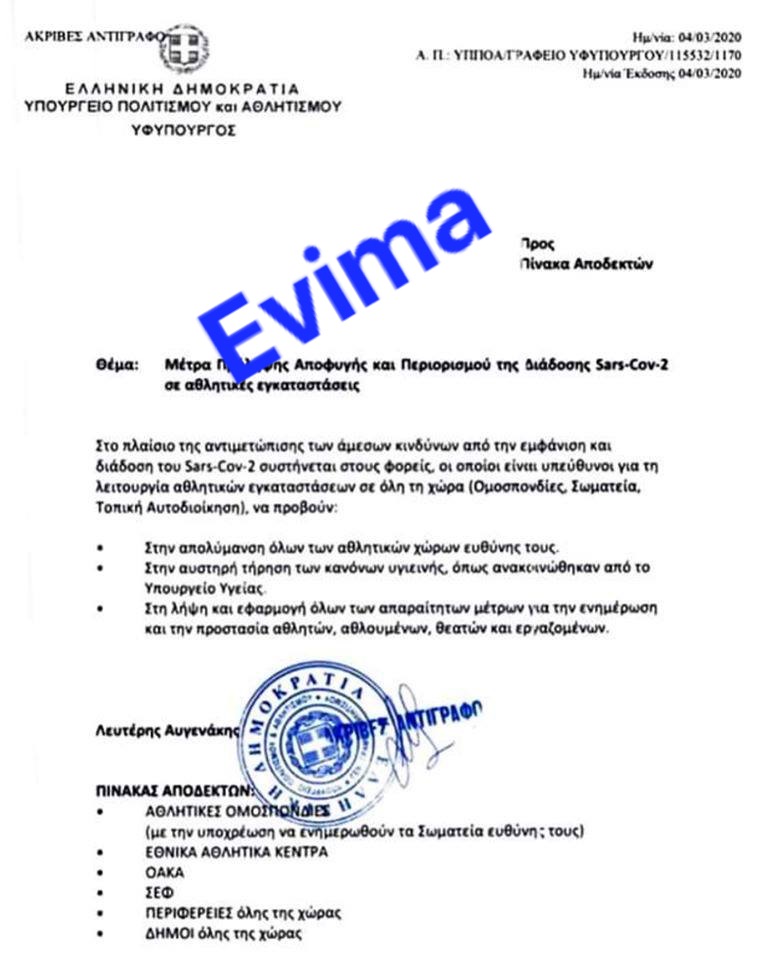Η επιστολή έφτασε σε όλα τα αθλητικά σωματεία και αναφέρει τα εξής: