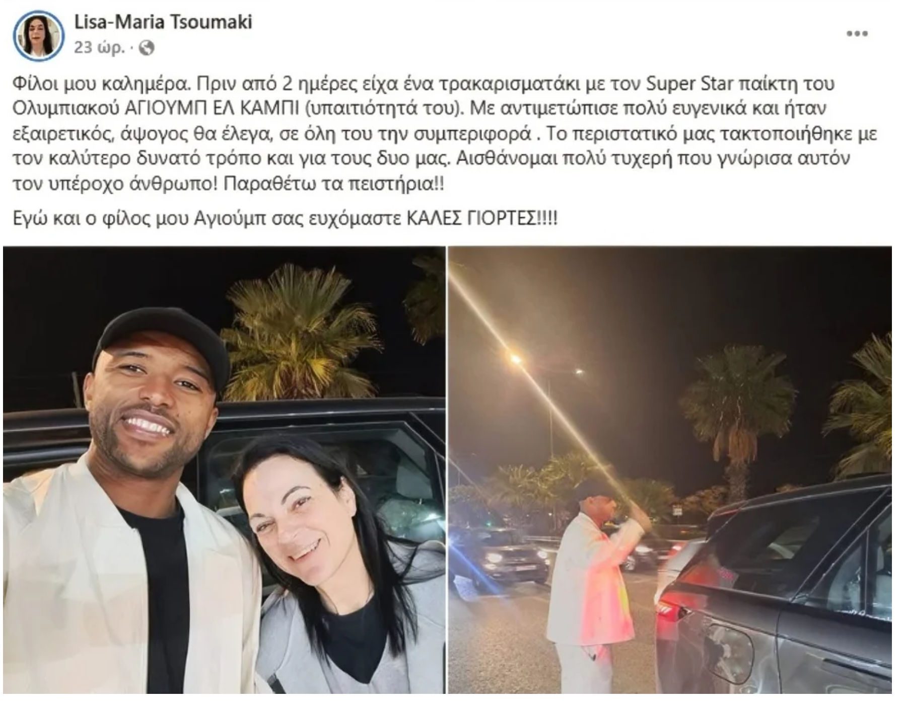 Αναλυτικά η ανάρτησή της: «Φίλοι μου καλημέρα. Πριν από 2 ημέρες είχα ένα τρακαρισματάκι με τον Super Star παίκτη του Ολυμπιακού ΑΓΙΟΥΜΠ ΕΛ ΚΑΜΠΙ (υπαιτιότητά του). Με αντιμετώπισε πολύ ευγενικά και ήταν εξαιρετικός, άψογος θα έλεγα, σε όλη του την συμπεριφορά . Το περιστατικό μας τακτοποιήθηκε με τον καλύτερο δυνατό τρόπο και για τους δυο μας. Αισθάνομαι πολύ τυχερή που γνώρισα αυτόν τον υπέροχο άνθρωπο! Παραθέτω τα πειστήρια!! Εγώ και ο φίλος μου Αγιούμπ σας ευχόμαστε ΚΑΛΕΣ ΓΙΟΡΤΕΣ!!!!».