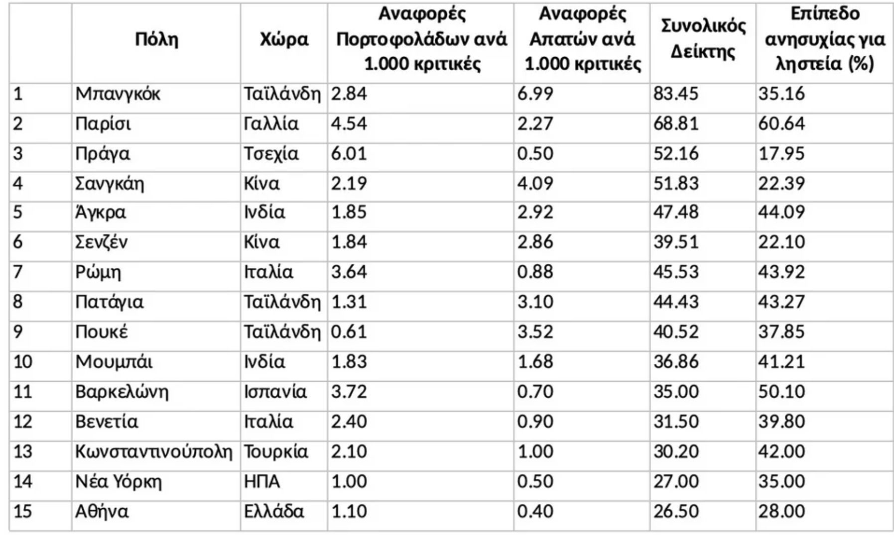 Η Αθήνα κατατάσσεται στην 15η θέση παγκοσμίως (και 19η σε ευρύτερη κατάταξη). Η Ακρόπολη και η Πλάκα εμφανίζουν σχεδόν 8 φορές λιγότερες αναφορές για κλοπές σε σχέση με το Παρίσι, καθιστώντας την ελληνική πρωτεύουσα ως ένας από τους πιο ασφαλείς προορισμούς της Ευρώπης για το 2025.