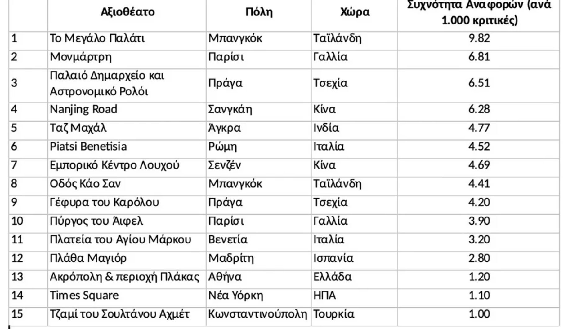 Η Ασία κυριαρχεί στη λίστα με 6 πόλεις στο Top10. Το Παρίσι (2ο) και η Ρώμη (7η) καταγράφουν σημαντικά περισσότερα περιστατικά από πόλεις όπως η Αθήνα (15η) και η Βενετία (12η).