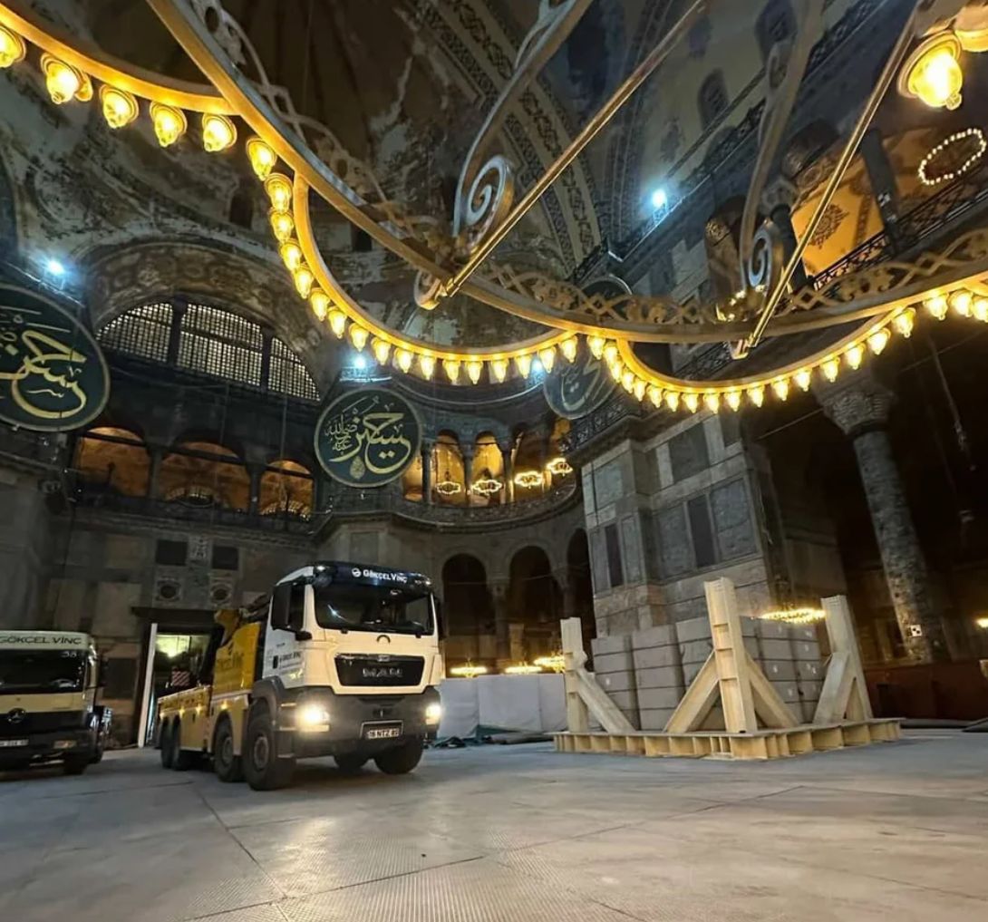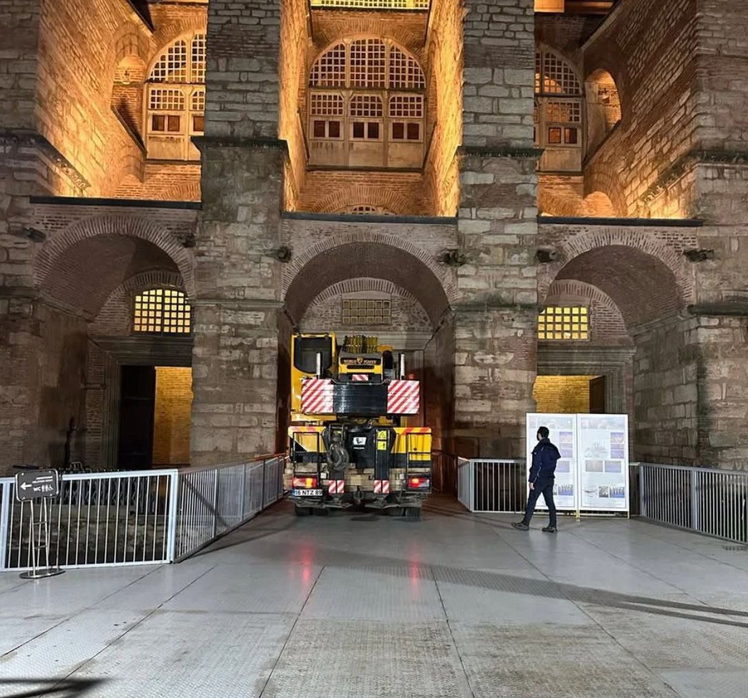 Έντονη ανησυχία έχει προκαλέσει η εμφάνιση ενός βαρέος τύπου φορτηγού με κινητό γερανό στο εσωτερικό της Αγίας Σοφίας, στο πλαίσιο των συνεχιζόμενων εργασιών αποκατάστασης.