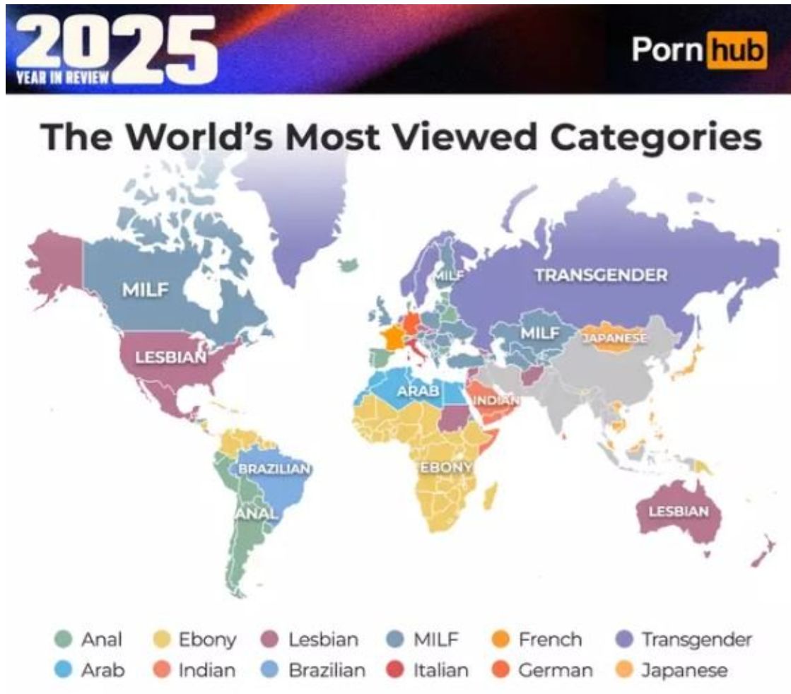 Στην Ελλάδα, οι χρήστες πορνό προτίμησαν κυρίως την κατηγορία Milf, η οποία βρέθηκε στην πρώτη θέση των αναζητήσεων. Στις ΗΠΑ και την Αυστραλία, το lesbian περιεχόμενο ήταν το πιο δημοφιλές, ενώ στον Καναδά προτιμήθηκε το MILF. Στη Ρωσία, τη Γροιλανδία και τμήματα της Σκανδιναβίας, η δημοφιλέστερη κατηγορία ήταν transgender. Στη Βραζιλία κυριάρχησε η κατηγορία Brazilian, στη Βόρεια Νότια Αμερική το Ebony, ενώ στη δυτική και νότια ακτή το Anal. Στην Ανατολική Ευρώπη, το Ηνωμένο Βασίλειο, την Ισπανία και την Πορτογαλία, οι κατηγορίες MILF και Anal ήταν οι πιο δημοφιλείς.