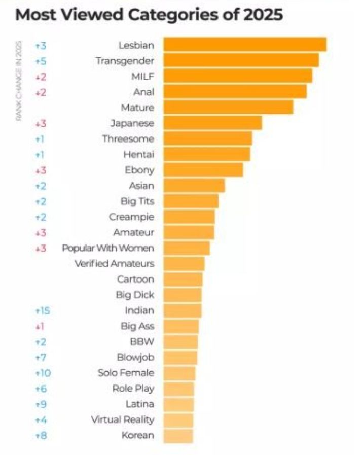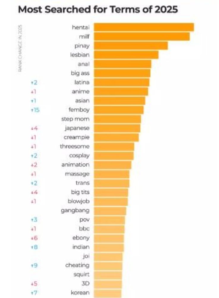 Για πέμπτη χρονιά στη σειρά, η λέξη Hentai ήταν η πιο δημοφιλής. Ακολουθούν MILF, Pinay, Lesbian, Anal, Big Ass, Latina, Anime, Asian και Femboy. Η λέξη Cheating αυξήθηκε εντυπωσιακά φέτος.