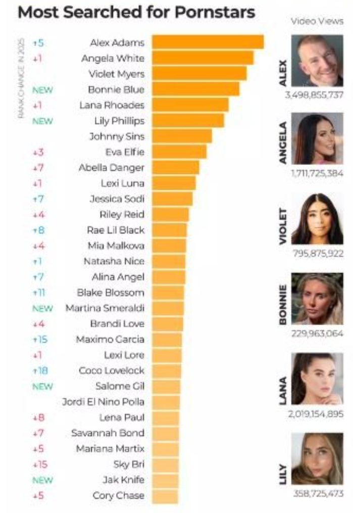 Οι χρήστες αναζήτησαν κυρίως τoν Alex Adams, ο οποίος ανέβηκε πέντε θέσεις. Ακολουθούν η Angela White, η Violet Myers, η Bonnie Blue και η Lana Rhodes. Νέες πορνοστάρ που ξεχώρισαν είναι η Martina Smeraldi, η Salome Gil και ο Jak Knife.