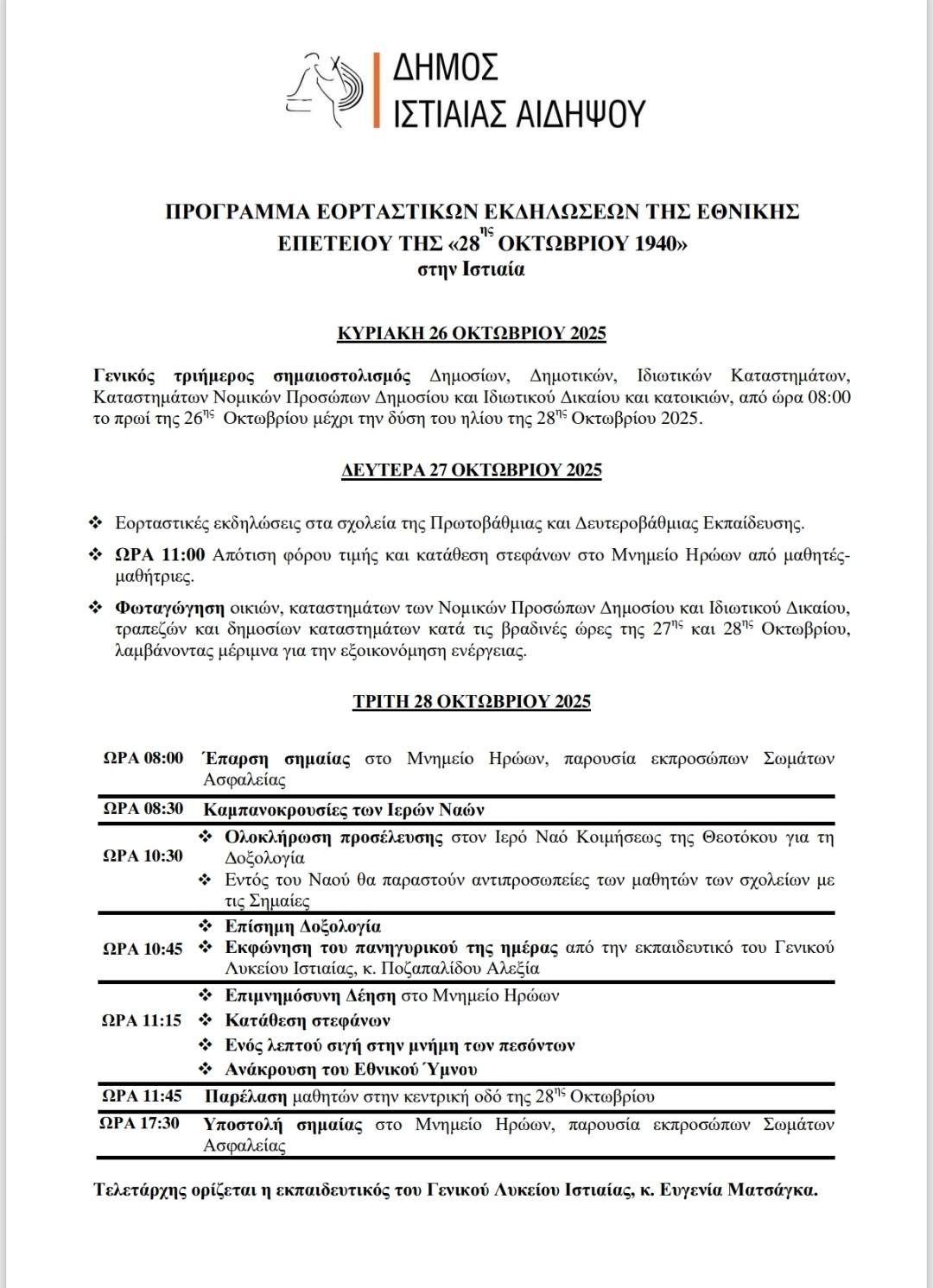 Τιμή και μνήμη στους ήρωες του 1940 από τον Δήμο Ιστιαίας – ΑιδηψούΜε κάθε επισημότητα και εθνική υπερηφάνεια θα τιμηθεί και φέτος η επέτειος της 28ης Οκτωβρίου 1940 στον Δήμο Ιστιαίας – Αιδηψού, με εκδηλώσεις που διοργανώνονται στην έδρα του Δήμου, την Ιστιαία.