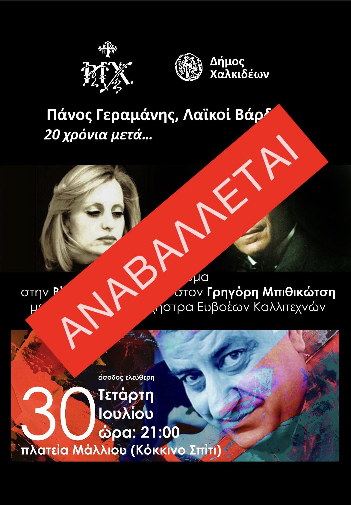 Ο Δήμος Χαλκιδέων ενημερώνει τους πολίτες ότι το Μουσικό Αφιέρωμα με τίτλο «Πάνος Γεραμάνης – Λαϊκοί Βάρδοι: 20 χρόνια μετά», το οποίο ήταν προγραμματισμένο να πραγματοποιηθεί την Τετάρτη 30 Ιουλίου 2025 στη Χαλκίδα, αναβάλλεται.