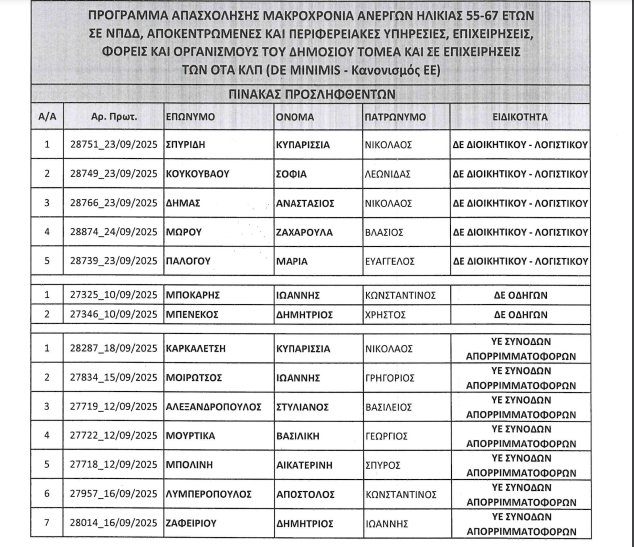 Όλα ονόματα των προσληφθέντων και οι ειδικότητες τους: