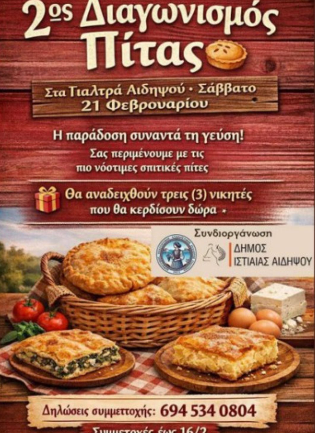 Αν αγαπάτε την μαγειρική και θέλετε να δοκιμάσετε την τύχη σας, συμμετάσχετε στον διαγωνισμό σπιτικής πίτας! Οι τρεις νικητές θα κερδίσουν συναρπαστικά δώρα και φυσικά, θα αποκτήσουν το τίτλο του καλύτερου «ζαχαροπλάστη» του καρναβαλιού.