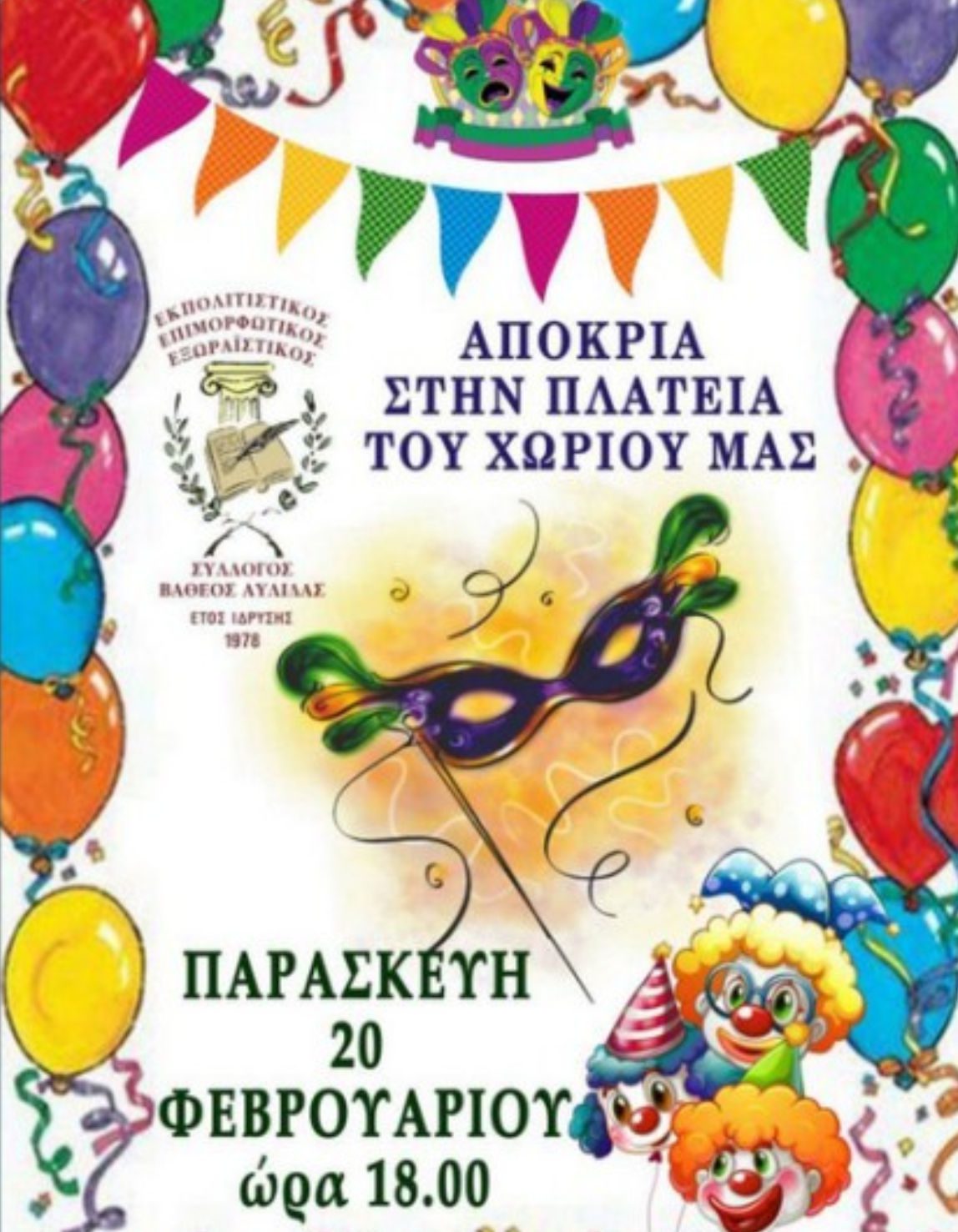 Ο Εκπολιτιστικός Επιμορφωτικός Εξωραϊστικός Σύλλογος Βαθέος Αυλίδας, με ιδιαίτερη χαρά και ενθουσιασμό, ανακοινώνει τη συμμετοχή του στις φετινές αποκριάτικες εκδηλώσεις του Δήμου Χαλκιδέων και του χωριού Βαθύ.