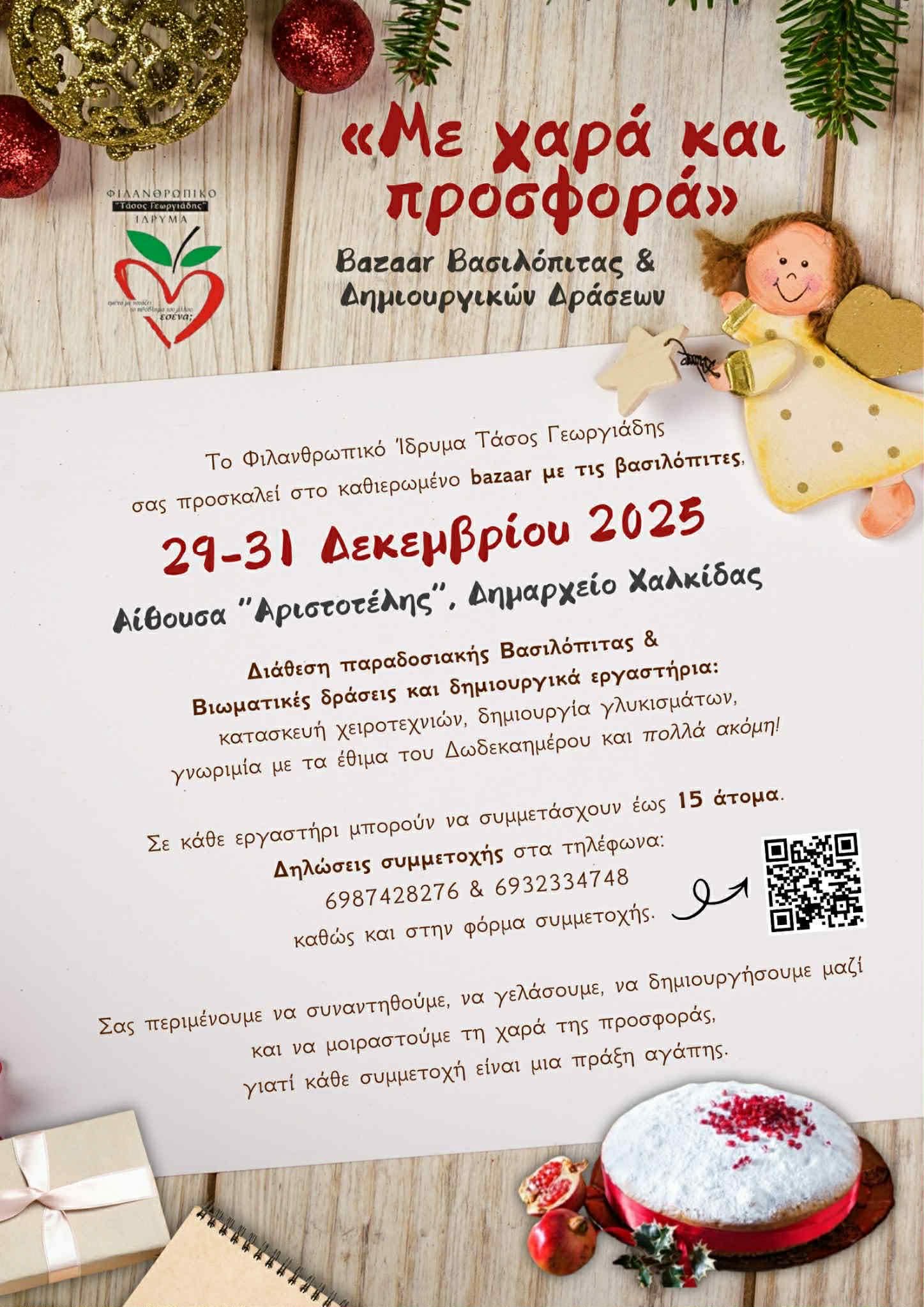 Το Φιλανθρωπικό Ίδρυμα «Τ. Γεωργιάδης» διοργανώνει και φέτος το καθιερωμένο, γιορτινό Bazaar Βασιλόπιτας & Δημιουργικών Δράσεων, μια εκδήλωση που έχει γίνει θεσμός αγάπης, αλληλεγγύης και δημιουργίας για μικρούς και μεγάλους.
