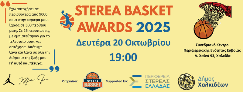 Τα Stereabasket Awards 2025 τιμούν τον Μάριο Τσαγγαρά!Έφτασε η ώρα της επίσημης ανακοίνωσης για τη γιορτή του μπάσκετ που διοργανώνει για 9η συνεχόμενη χρονιά η ιστοσελίδα μας, με τα Stereabasket Awards να αποτελούν πλέον θεσμό και σημείο αναφοράς για το μπάσκετ της Περιφέρειας Στερεάς Ελλάδας και όχι μόνο!
