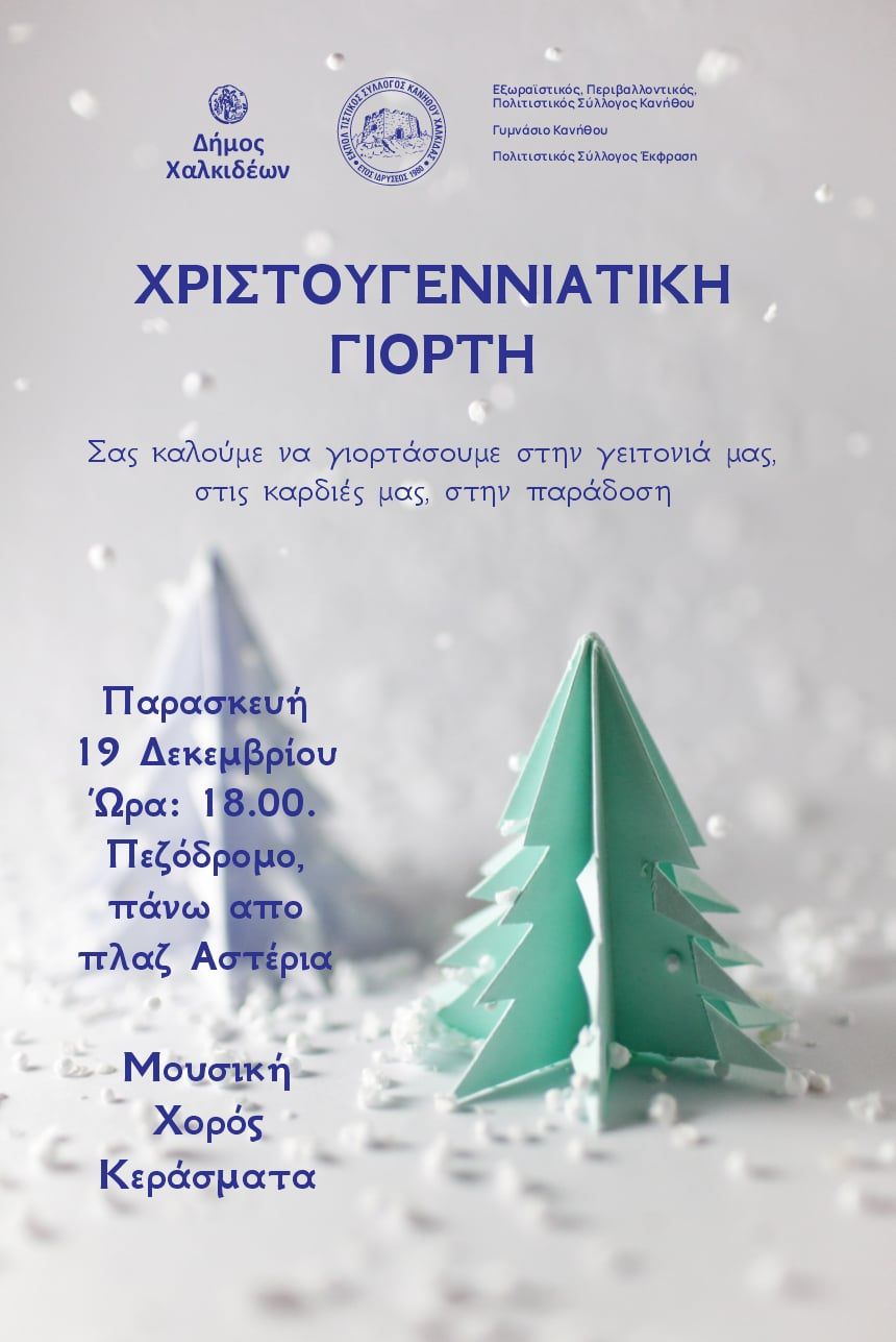 Ο Δήμος Χαλκιδέων, σε συνεργασία με τον Εκπολιτιστικό Σύλλογο Κανήθου, το Γυμνάσιο Κανήθου, τον Εξωραϊστικό, Περιβαλλοντικό και Πολιτιστικό Σύλλογο Κανήθου και τον Πολιτιστικό Σύλλογο «Έκφραση», προσκαλούν όλους τους κατοίκους, μικρούς και μεγάλους, σε μια ξεχωριστή γιορτή που θα πραγματοποιηθεί στη γειτονιά της Κανήθου.
