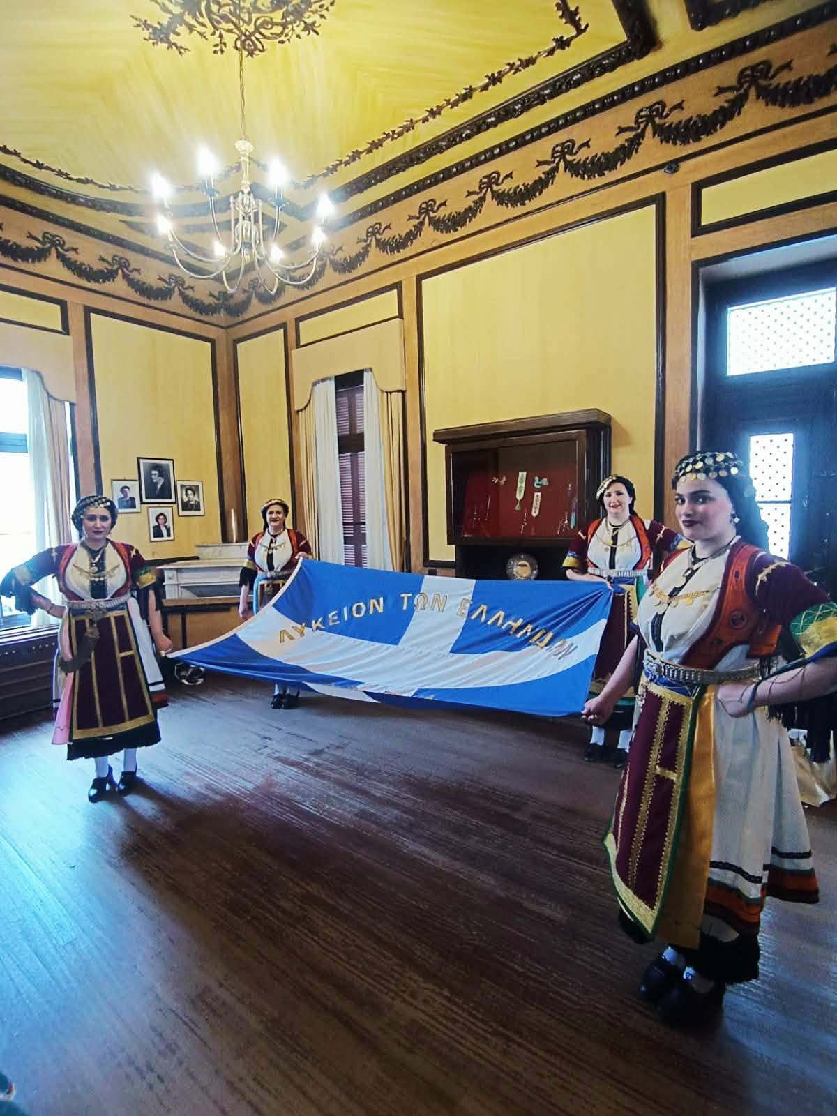Τη σημαία κράτησαν 4 Λυκειάδες ενδεδυμένες με την καραγκούνικη φορεσιά, το πρώτο αντικείμενο της συλλογής του Ιδρύματος Βασίλη Παπαντωνίου.