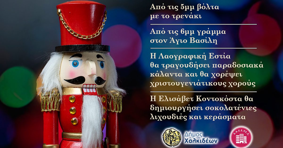 Ο Δήμος Χαλκιδέων, μέσω της Δημοτικής Ανώνυμης Επιχείρησης Εκμετάλλευσης Περιουσίας Χαλκίδας (Δ.Α.Ε.Ε.ΠΕ.Χ), σας προσκαλεί την Παρασκευή 29 Δεκεμβρίου 2023, από τις 5 το απόγευμα, για να απολαύσετε μελωδίες, κεράσματα και πολλές δράσεις, για μικρούς και μεγάλους.