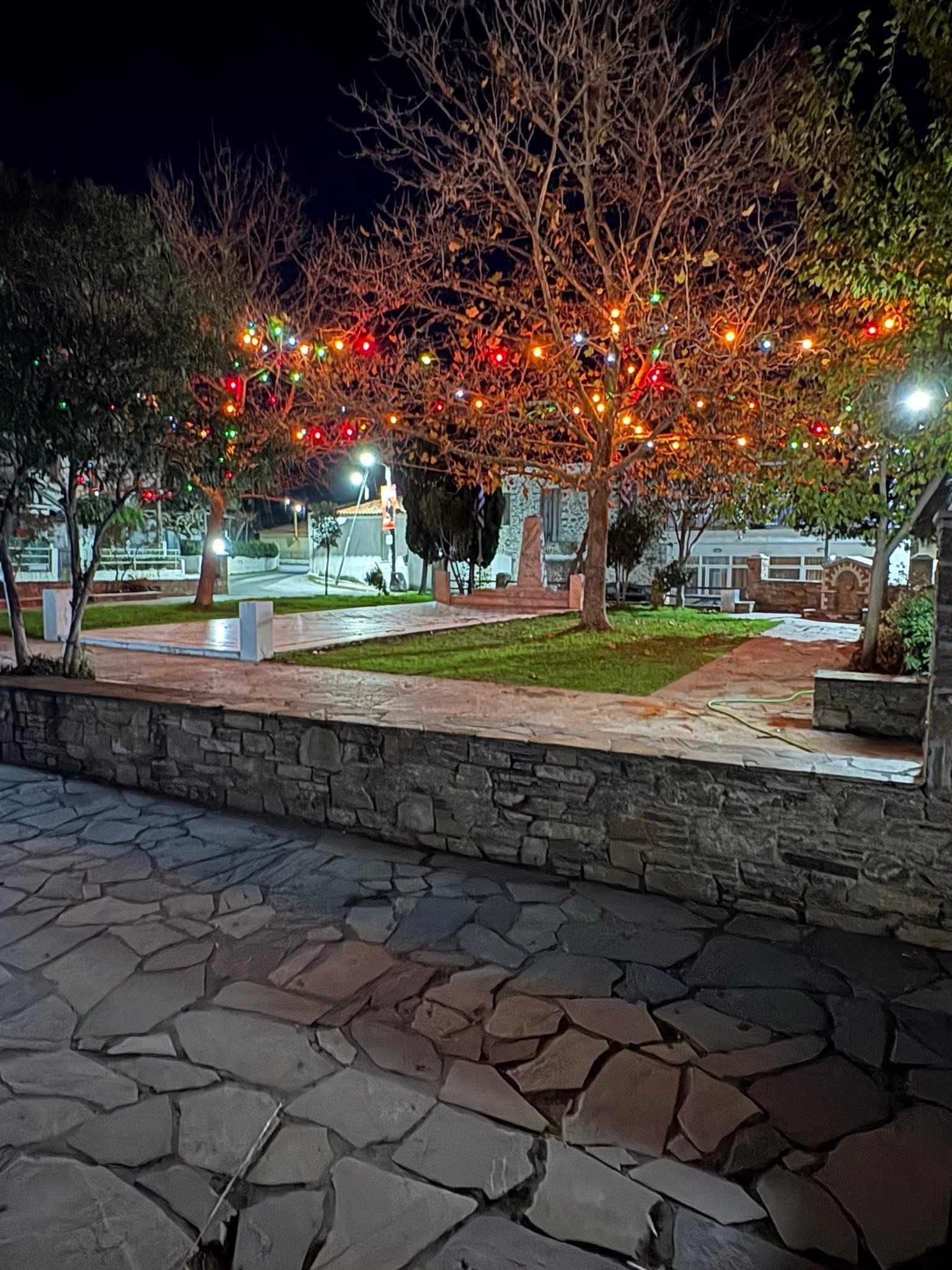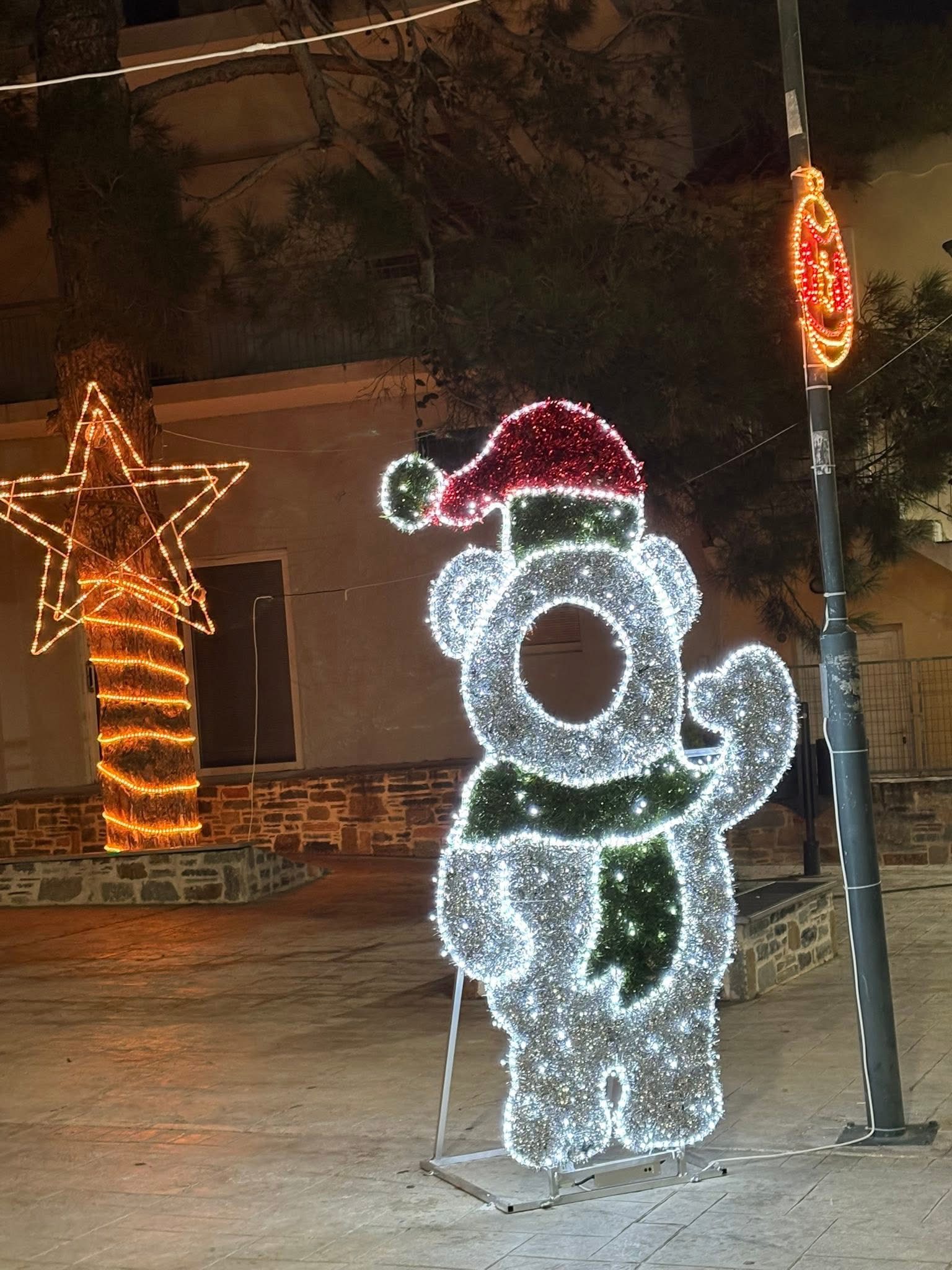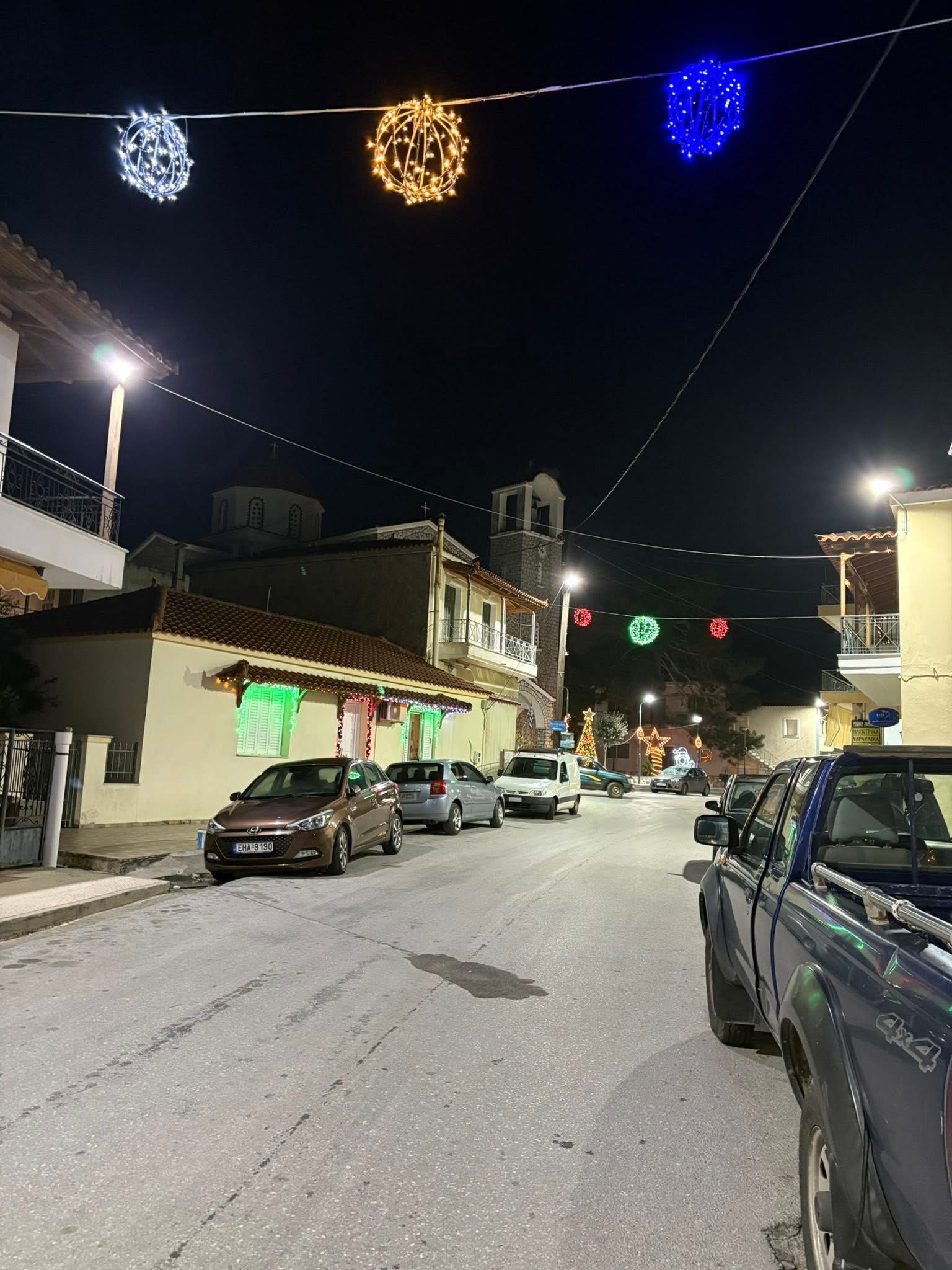 Στους κεντρικούς δρόμους, φωτεινές μπάλες κρέμονται πάνω από το οδόστρωμα, ενώ τα σπίτια στολισμένα με πράσινα και κόκκινα λαμπάκια συμπληρώνουν την εικόνα. Στο βάθος, το χριστουγεννιάτικο δέντρο και οι φωτεινές φιγούρες που κοσμούν την πλατεία δίνουν την αίσθηση μιας μικρής χριστουγεννιάτικης πολιτείας που ζωντανεύει κάθε βράδυ.