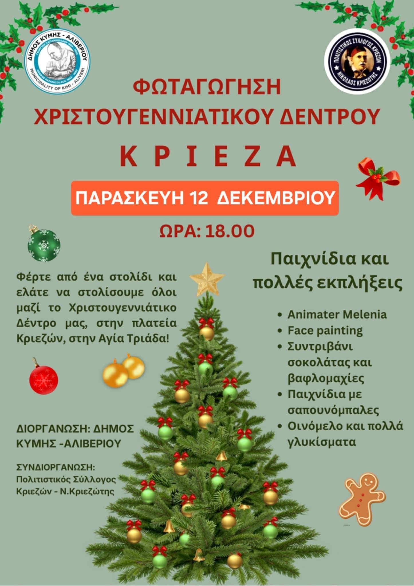 Τα Κριεζά στολίστηκαν γιορτινά! Δείτε το εντυπωσιακό Χριστουγεννιάτικο δέντρο μπροστά στην πανέμορφη εκκλησία του χωριού και ζήστε τη μαγεία των Χριστουγέννων.Ο Δήμος Κύμης – Αλιβερίου και η Κοινότητα σε συνεργασία με τον Πολιτιστικό Σύλλογο Κριεζών – Ν. Κριεζώτης, προσκαλεί όλους τους κατοίκους και επισκέπτες στη φετινή χριστουγεννιάτικη εκδήλωση για τη φωταγώγηση του Χριστουγεννιάτικου Δέντρου στα Κριεζά.
