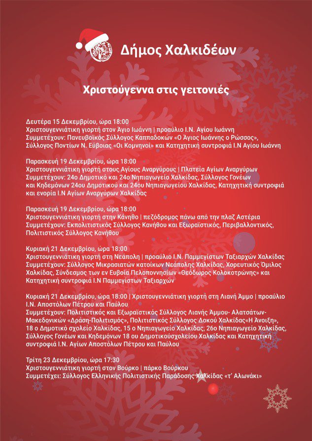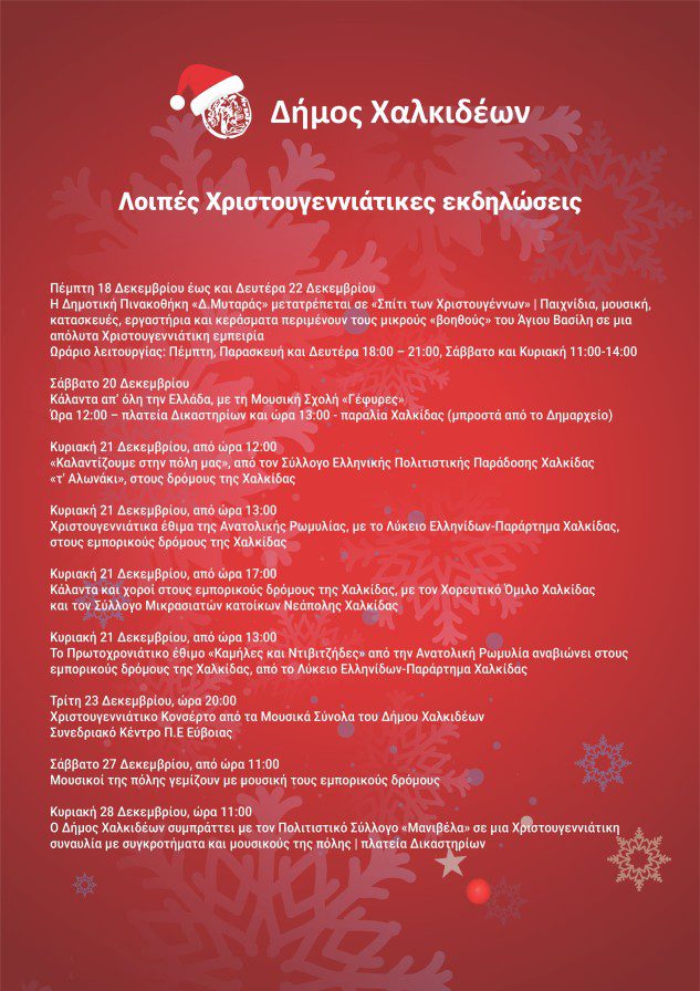 - Κυριακή 21 Δεκεμβρίου, από ώρα 17:00 | Κάλαντα και χοροί στους εμπορικούς δρόμους της Χαλκίδας, με τον Χορευτικό Όμιλο Χαλκίδας και τον Σύλλογο Μικρασιατών κατοίκων Νεάπολης Χαλκίδας