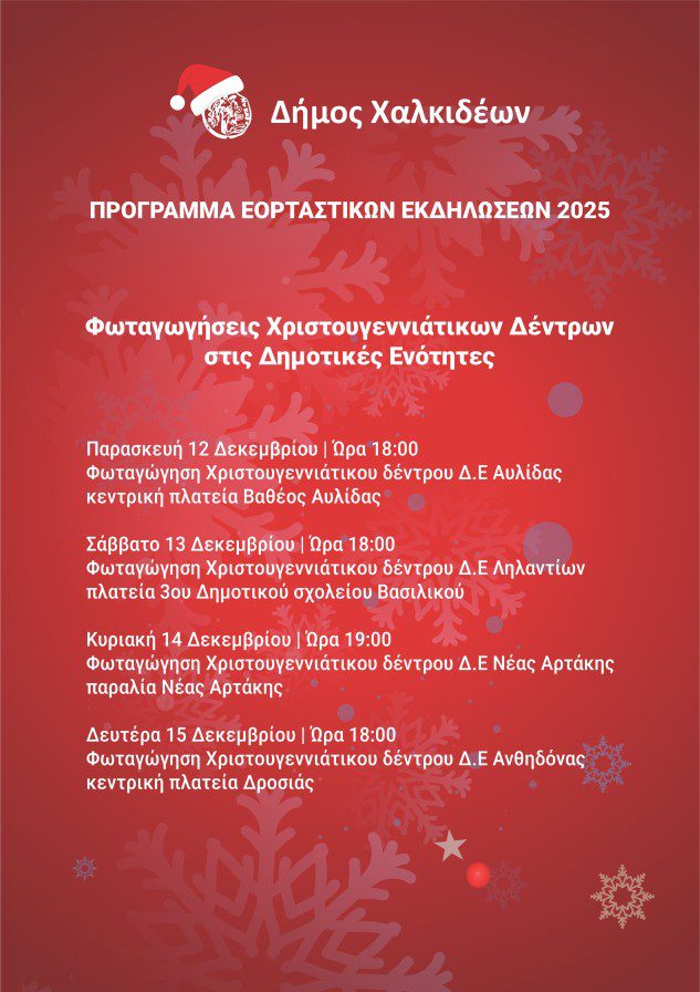 Ο Δήμος Χαλκιδέων έχει «φορέσει» από νωρίς τα γιορτινά του και είναι έτοιμος να υποδεχθεί την πιο λαμπερή εποχή του χρόνου, με πλήθος εορταστικών εκδηλώσεων σε γειτονιές της Χαλκίδας και σε όλες τις Δημοτικές Ενότητες.