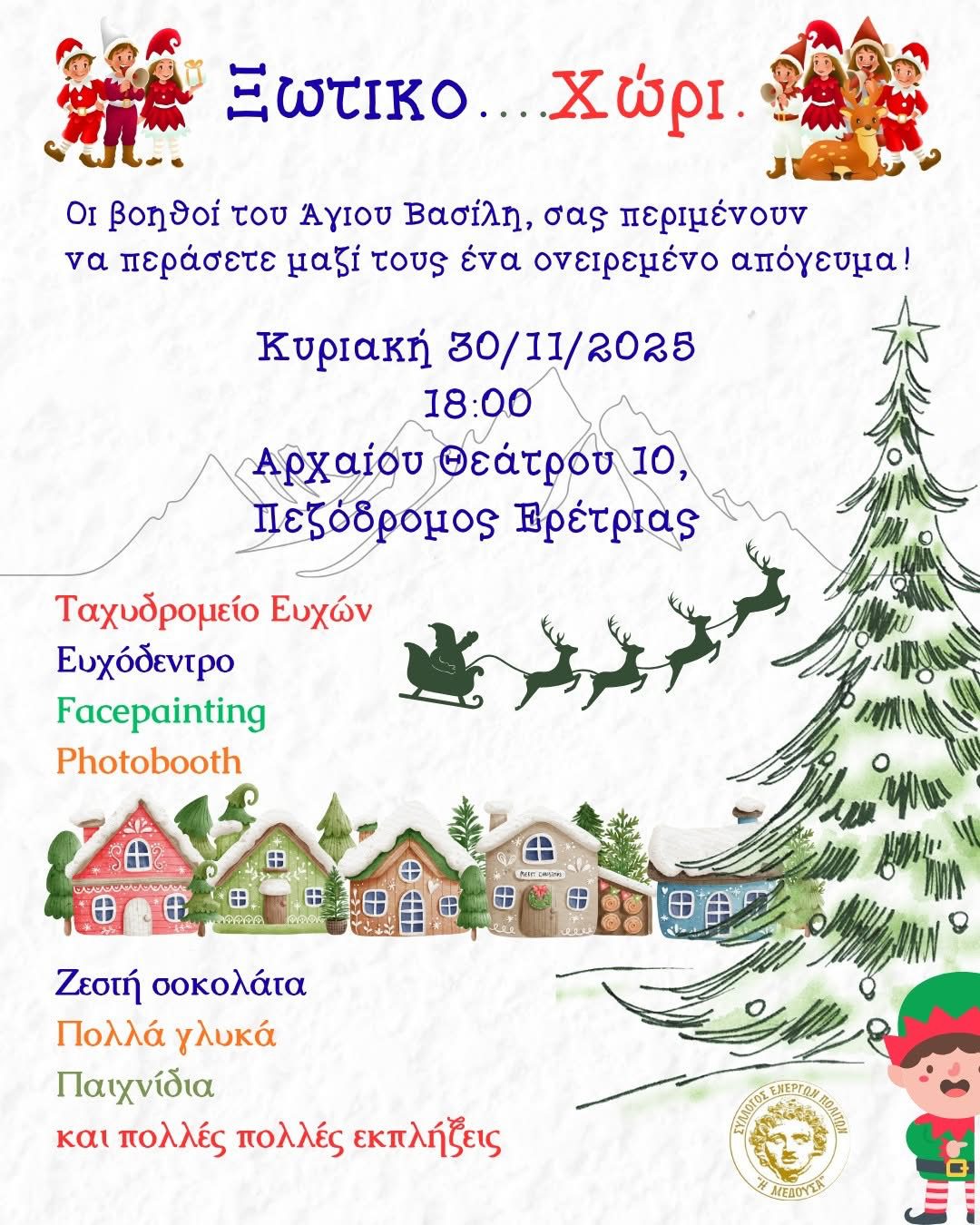 Η Ερέτρια φορά τα γιορτινά της και ετοιμάζει το Ξωτικό….Χώρι!Η Ερέτρια μπαίνει δυναμικά στο πνεύμα των Χριστουγέννων και ετοιμάζεται να φορέσει τα… καλά της από άκρη σε άκρη! Με τρεις μεγάλες εκδηλώσεις που θα ανοίξουν επίσημα την αυλαία της πιο φωτεινής εποχής του χρόνου, ο Δήμος Ερέτριας και οι ενεργοί σύλλογοι της περιοχής υπόσχονται να χαρίσουν σε μικρούς και μεγάλους μοναδικές στιγμές χαράς, λάμψης και γιορτινής μαγείας.
