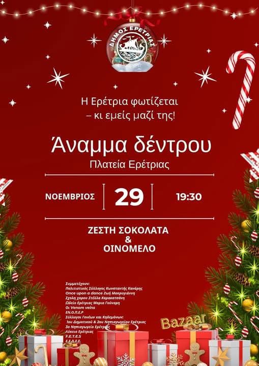 Η γιορτινή συνέχεια μεταφέρεται στην κεντρική πλατεία Ερέτριας, όπου ο Δήμος και οι τοπικοί σύλλογοι ενώνουν τις δυνάμεις τους για μια μεγάλη δημόσια εκδήλωση. Με μουσική, κεράσματα και εορταστική διάθεση, το κεντρικό δέντρο της πόλης θα φωτίσει τον χειμωνιάτικο ουρανό και θα σηματοδοτήσει επίσημα την έναρξη της χριστουγεννιάτικης περιόδου.