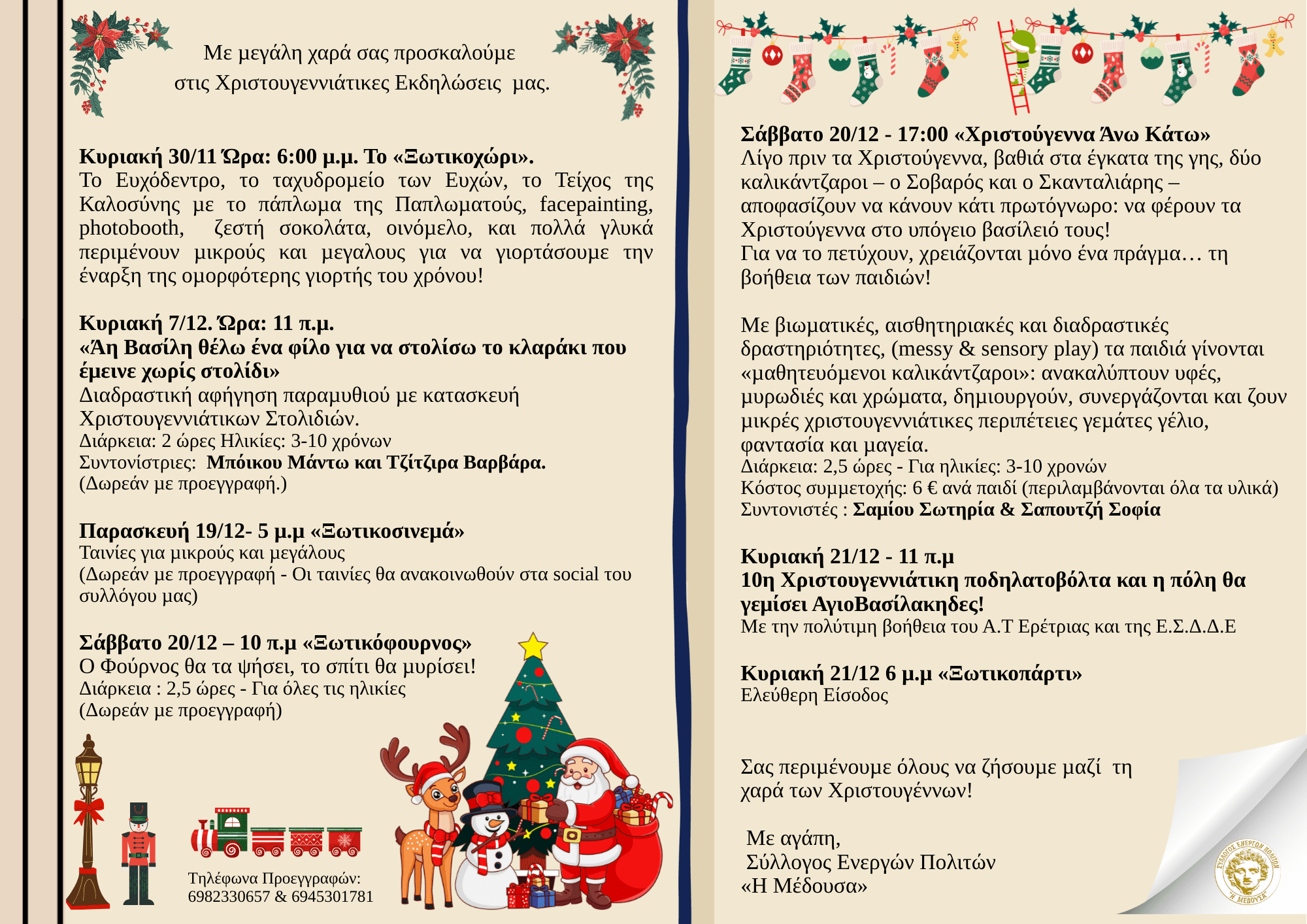 Ο Σύλλογος Ενεργών Πολιτών «Η Μέδουσα» με μεγάλη χαρά ανακοινώνει την έναρξη των φετινών Χριστουγεννιάτικων Εκδηλώσεων, που ξεκινούν σήμερα, Κυριακή 30 Νοεμβρίου, με το αγαπημένο «Ξωτικοχώρι» – μια γιορτινή δράση που θα σημάνει επίσημα την έναρξη της πιο μαγικής εποχής του χρόνου.