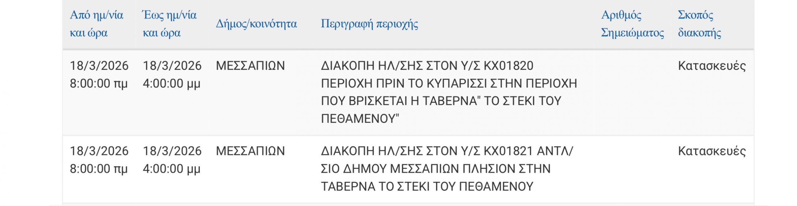 Διακοπή ρεύματος σήμερα (18/3) σε περιοχές της Εύβοιας – Πίνακας