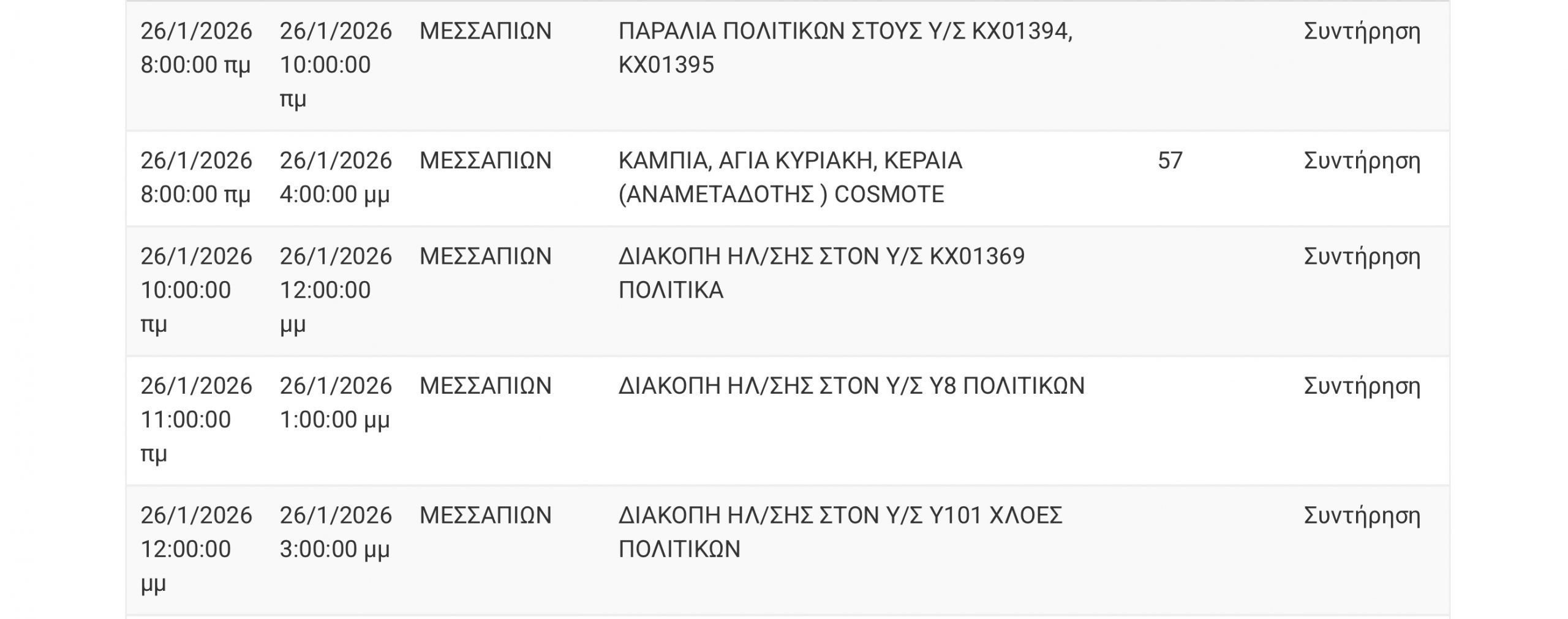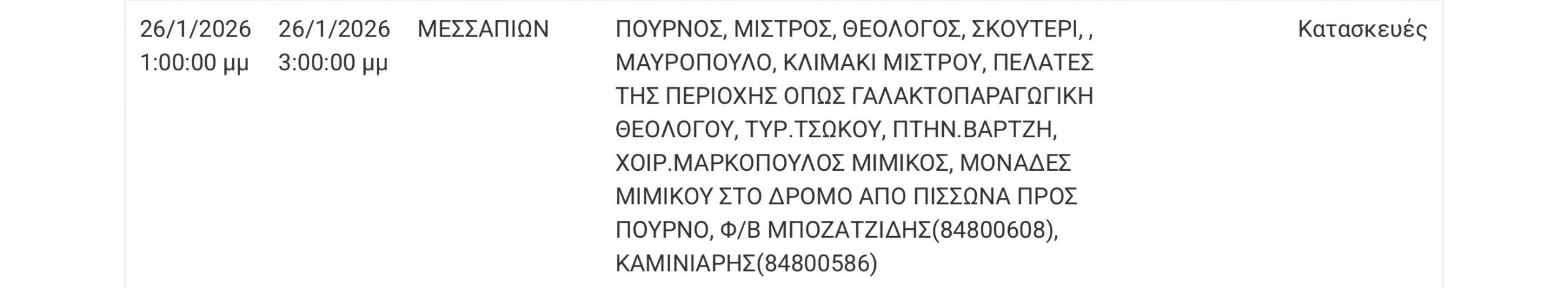 Διακοπή ρεύματος σήμερα (26/1) σε πολλές περιοχές της Εύβοιας