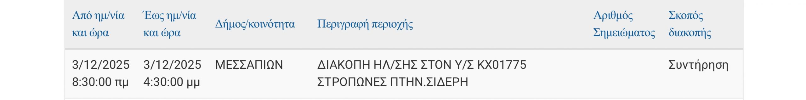 Διακοπή ρεύματος σήμερα Τετάρτη 3 Δεκεμβρίου σε χωριό της Εύβοιας.