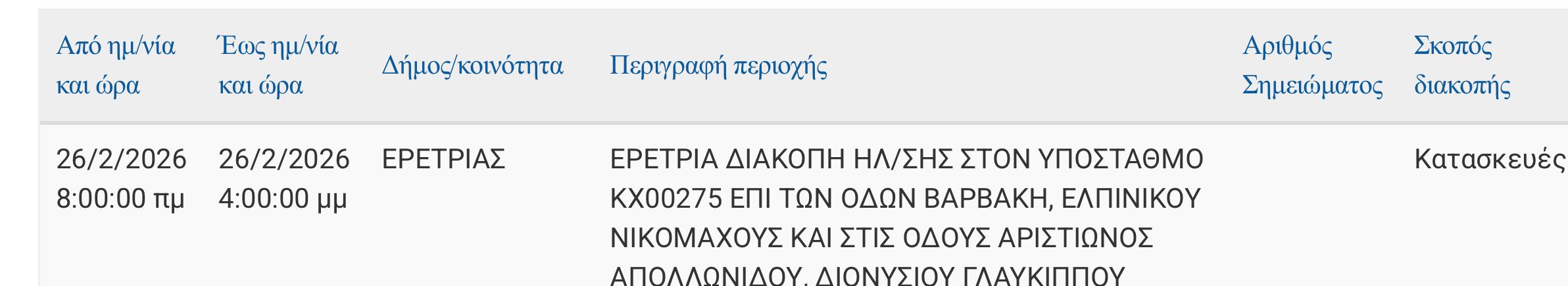 Χωρίς ρεύμα θα μείνουν σήμερα Πέμπτη 26, Φεβρουαρίου περιοχές στο δήμο της Ερέτριας την Εύβοια.