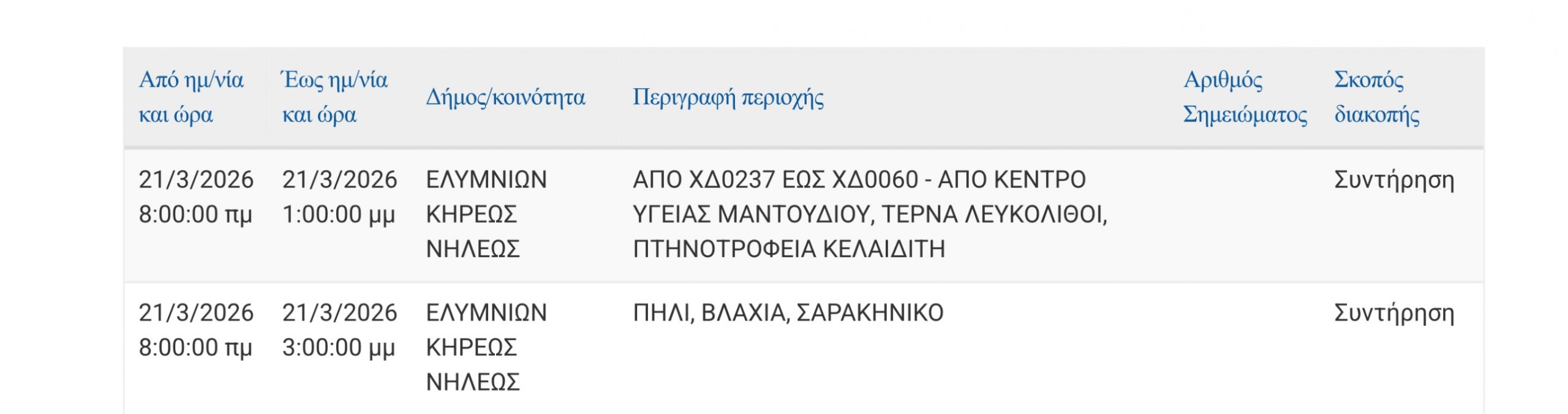Διακοπή ρεύματος σήμερα Σάββατο 21 Μαρτίου σε περιοχές της Βόρειας Εύβοιας.