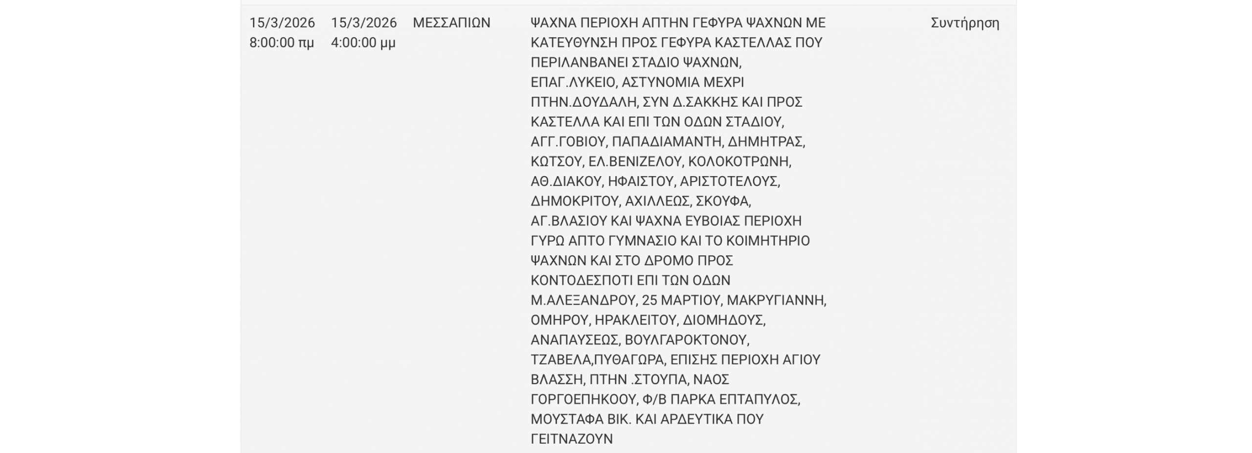 Προκειμένου να προγραμματίσετε τις εργασίες σας και να ελαχιστοποιηθεί η όχλησή σας, στον ακόλουθο πίνακα, μπορείτε να ενημερωθείτε για τις περιοχές και τις ώρες προγραμματισμένων διακοπών ηλεκτροδότησης.