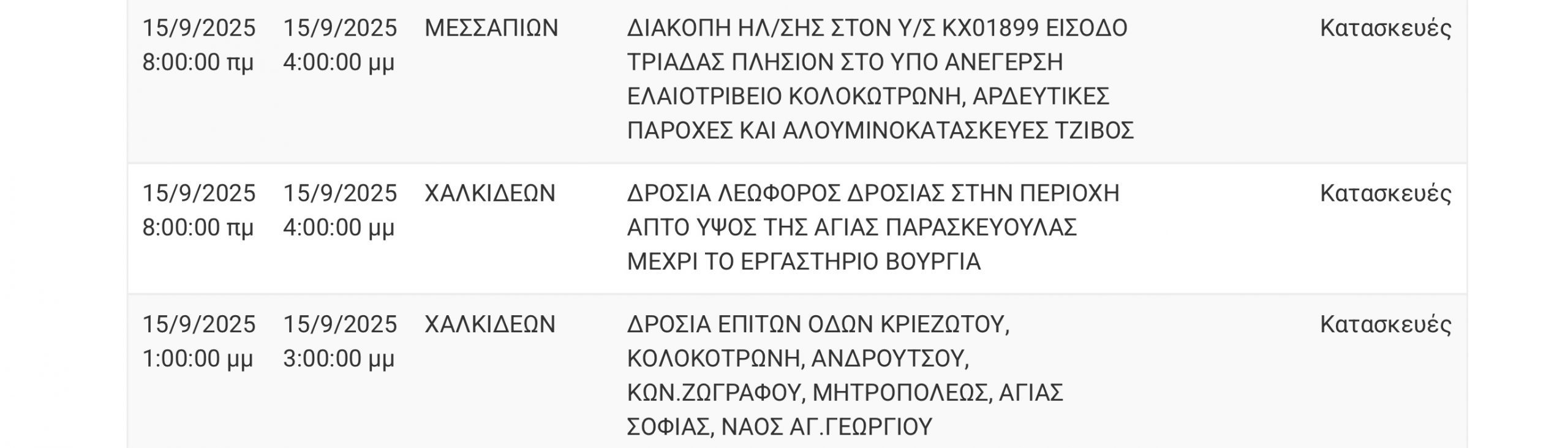 Διακοπή ρεύματος σήμερα Δευτέρα 15 Σεπτεμβρίου σε αρκετές περιοχές της Εύβοιας.
