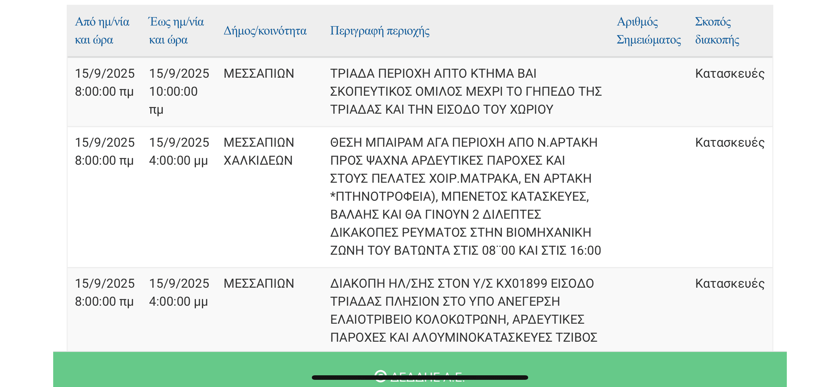 Διακοπή ρεύματος σήμερα σε αρκετές περιοχές της Εύβοιας – Πίνακας