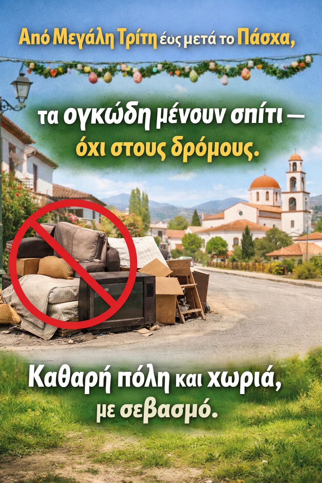 Ο Δήμος Κύμης-Αλιβερίου ενημερώνει τους πολίτες ότι, μέχρι και μετά το Πάσχα, τα ογκώδη αντικείμενα πρέπει να παραμείνουν στα σπίτια και δεν θα τοποθετούνται στους δρόμους. Η πρωτοβουλία αυτή έχει στόχο τη διατήρηση καθαρών και ασφαλών δημόσιων χώρων τόσο στην πόλη όσο και στα χωριά του δήμου.