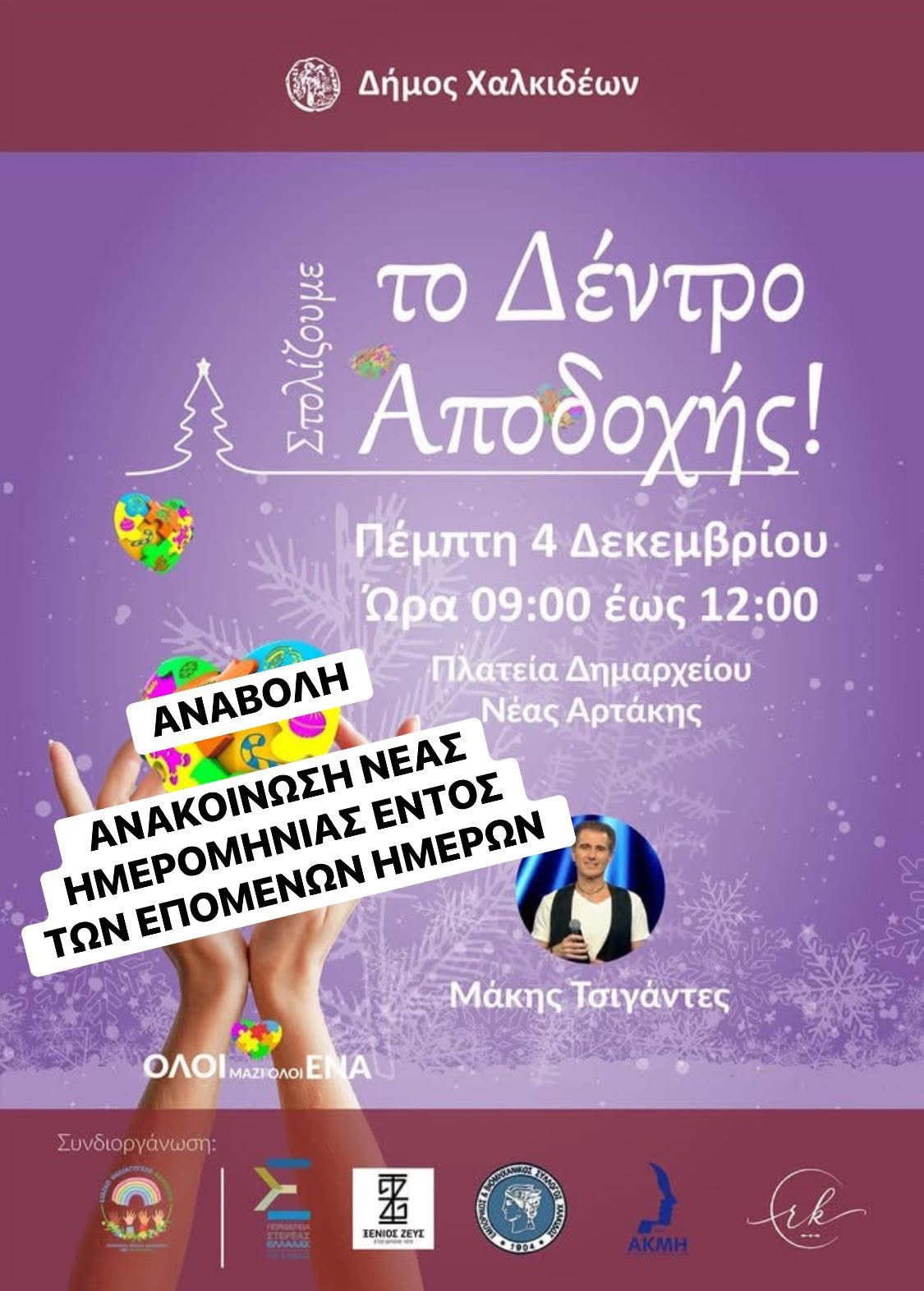 Η Δημοτική Ενότητα Νέας Αρτάκης του Δήμου Χαλκίδεων σας ενημερώνει ότι, λόγω των αναμενόμενων δυσμενών καιρικών συνθηκών, η προγραμματισμένη αυριανή εκδηλωση
