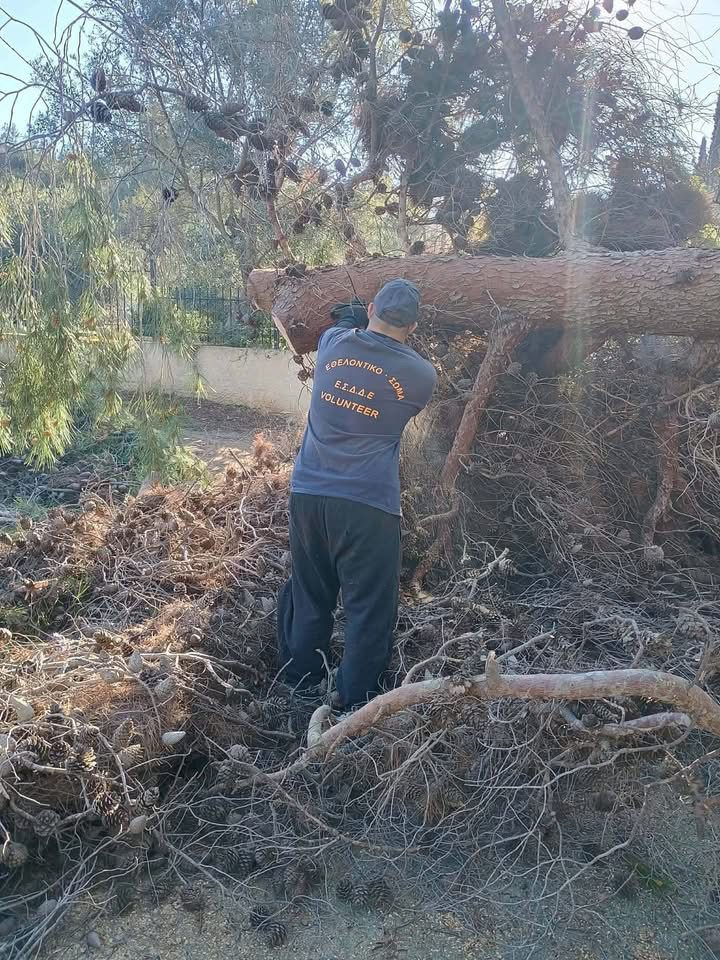 Εθελοντές του Ε.Σ.Δ.Δ.Ε. καθαρίζουν δρόμο από πεσμένο δέντρο.