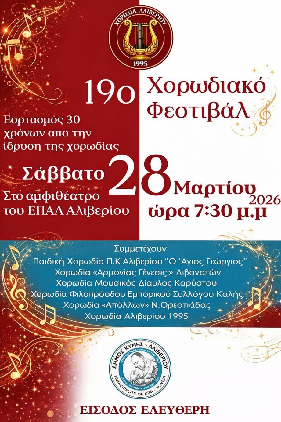 Η Χορωδία Αλιβερίου συμπληρώνει φέτος τρεις δεκαετίες από την ίδρυσή της και ετοιμάζεται να γιορτάσει την πορεία της με το 19ο Φεστιβάλ Χορωδιών.