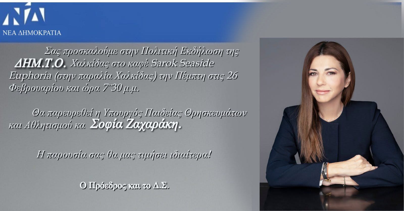 Η Δημοτική Τοπική Οργάνωση Χαλκίδας της Νέας Δημοκρατίας διοργανώνει πολιτική εκδήλωση την Πέμπτη 26 Φεβρουαρίου και ώρα 19:30, στο καφέ Sarok Seaside Euphoria, στην παραλία Χαλκίδας.