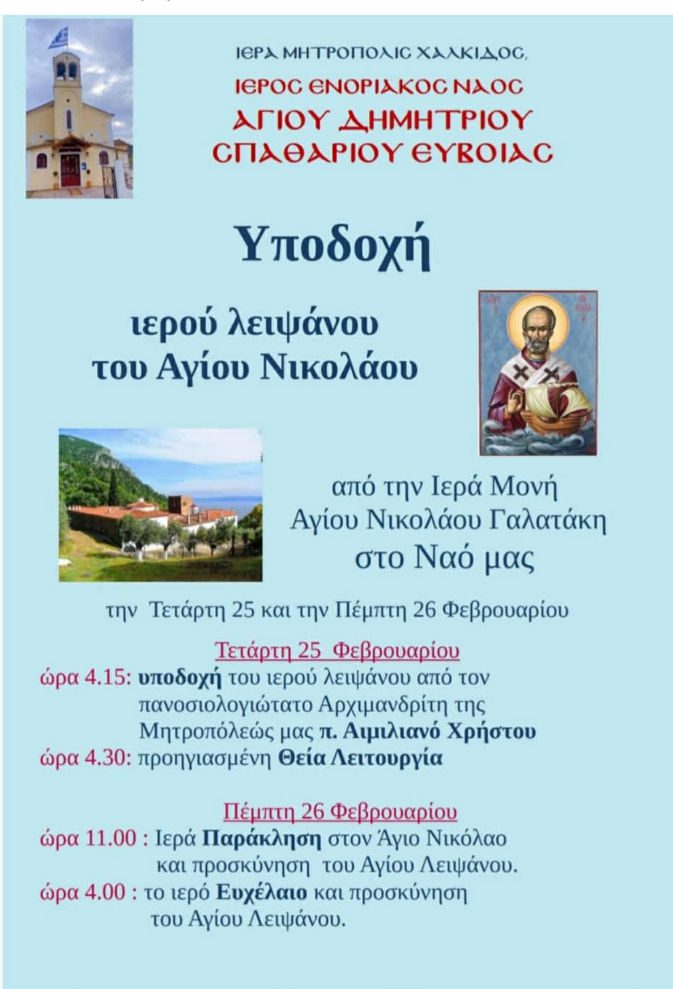 Με ιδιαίτερη κατάνυξη και πνευματική χαρά αναμένονται οι θρησκευτικές εκδηλώσεις που θα λάβουν χώρα στο Σπαθάρι Ευβοίας, καθώς η τοπική κοινωνία υποδέχεται το Ιερό Λείψανο του Αγίου Νικολάου.