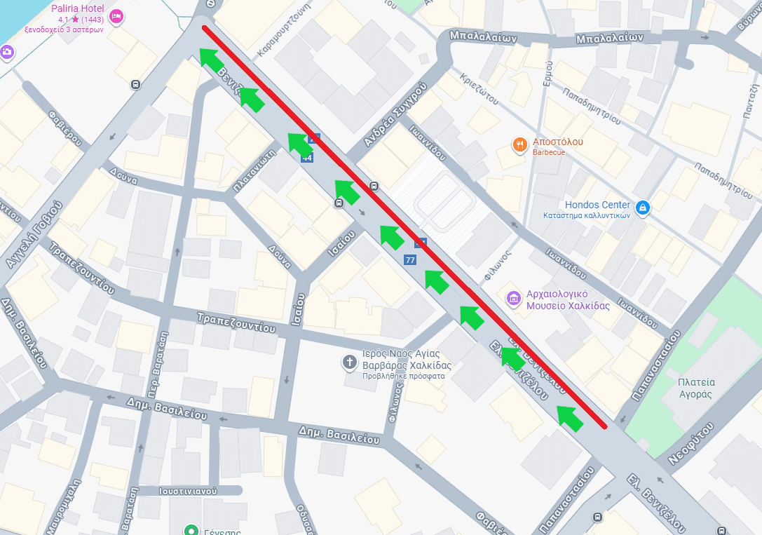 - Τα οχήματα που εισέρχονται στη Λεωφόρο Ελ. Βενιζέλου, μέσω των οδών Παπαναστασίου, Ισαίου, Πλατανιώτη και Βαρατάση θα μπορούν να κινηθούν μόνο με κατεύθυνση προς την παραλία Χαλκίδας.