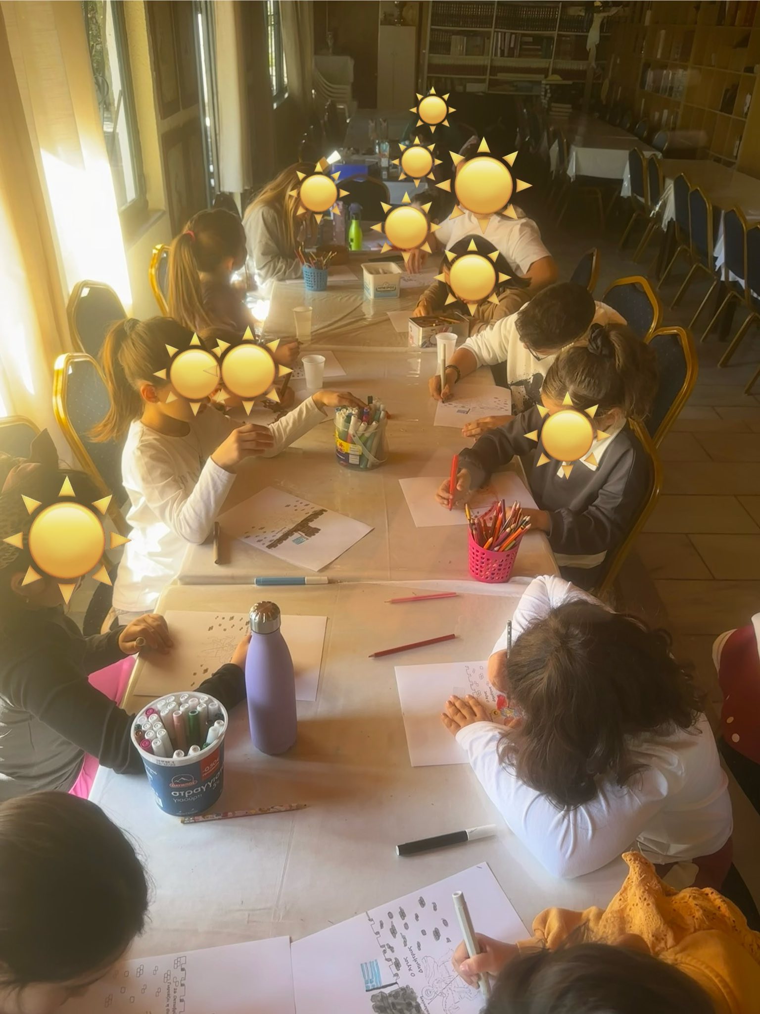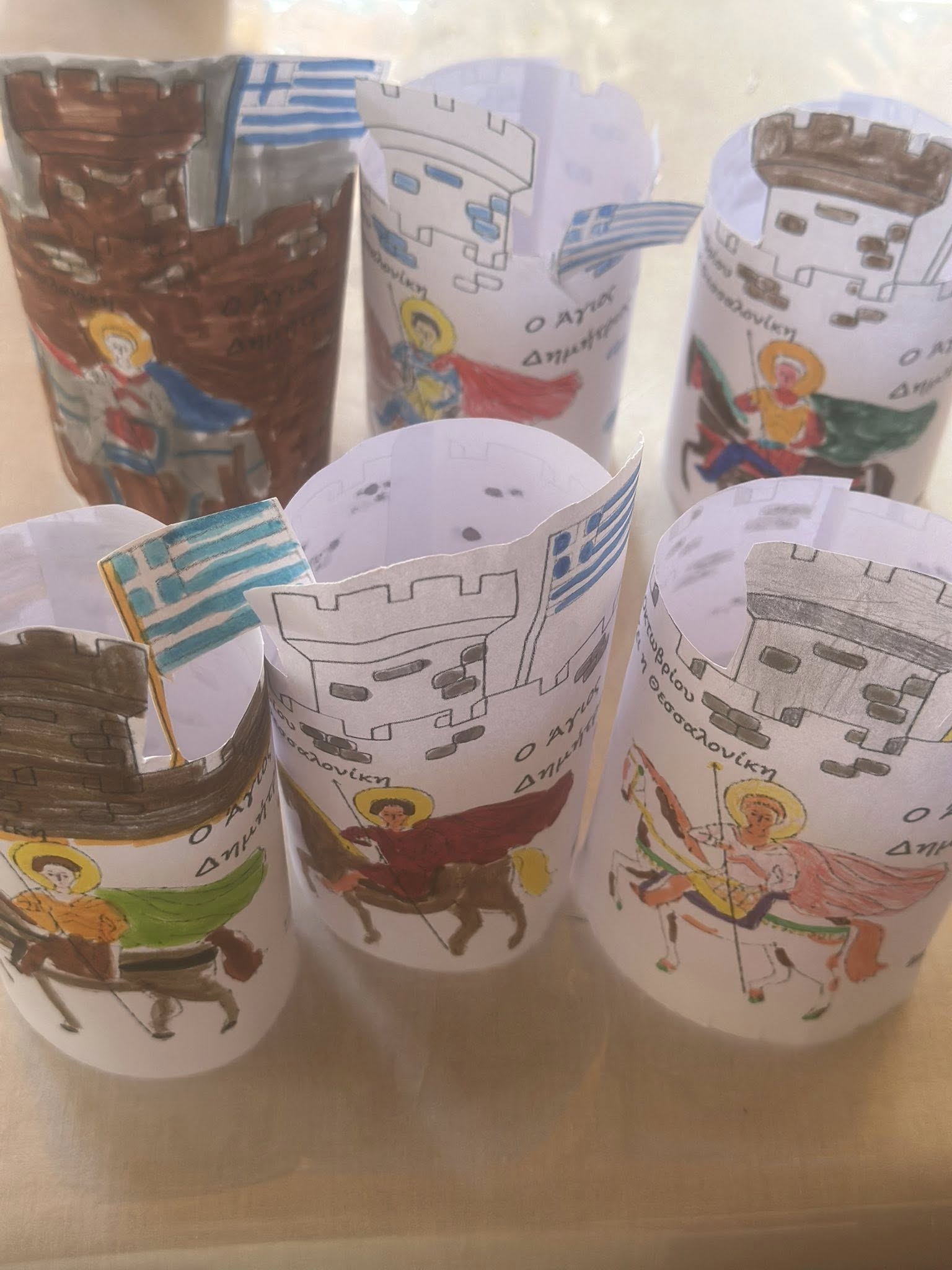 Όπως βλέπουμε στις παρακάτω εικόνες τα παιδιά ζωγράφισαν τόσο τον Άγιο Δημήτριο όσο και τον αείμνηστο Έλληνα τραγουδοποιό, συνθέτη και στιχουργό, Διονύση Σαββόπουλο.
