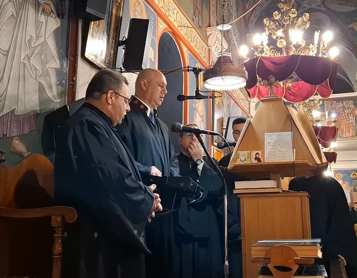 Επίσης στο αναλόγιο έψαλαν ο Πρωτοψάλτης του ιερού ναού κ. Ευάγγελος Πολύχρονος με τον ιερψάλτη του ιερού ναού κ. Δημήτριο Πετρογιάννη και τους ιεροψάλτες κ. Ζανή Ζαμάνο κ. Γεώργιο Παπαγεωργίου και τους Αναγνώστες Ανάργυρο Αργύρη και Ζαχαρία Δημητριάδη.