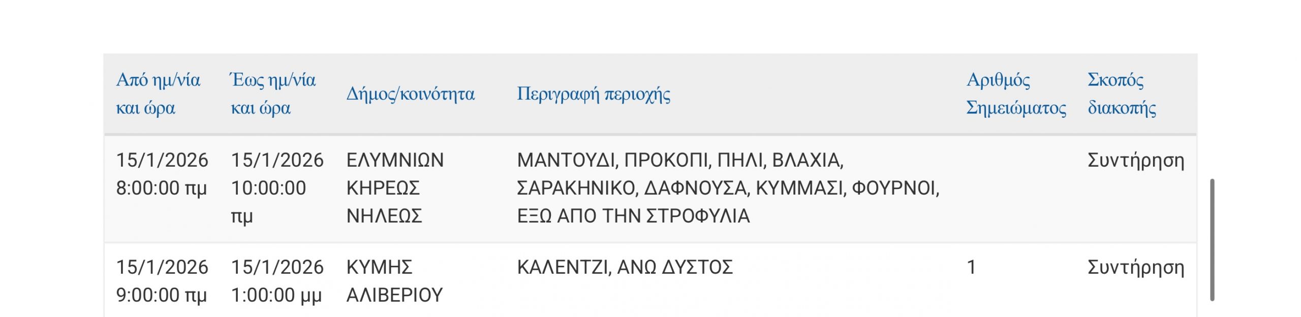 Εύβοια: Διακοπή ρεύματος σήμερα (15/1) σε αυτές τις περιοχές