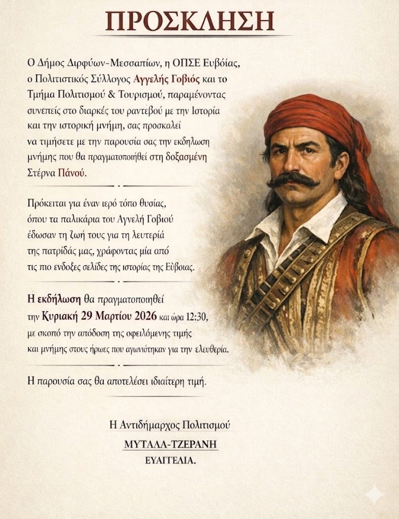 Ο Δήμος Διρφύων–Μεσσαπίων, η ΟΠΣΕ Εύβοιας και ο Πολιτιστικός Σύλλογος Αγγελή Γοβιού διοργανώνουν εκδήλωση μνήμης αφιερωμένη στον ήρωα της Εύβοιας Αγγελή Γοβιό και τους συναγωνιστές του.