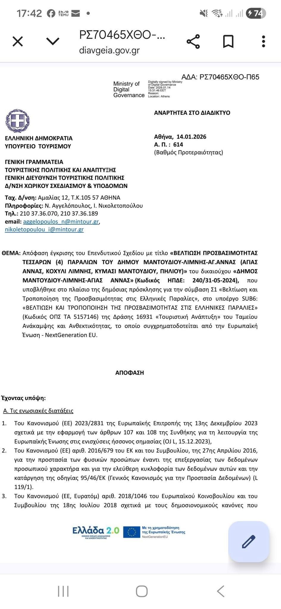 Ο Δήμος Μαντουδίου – Λίμνης – Αγίας Άννας ανακοινώνει με χαρά την έγκριση χρηματοδότησης ύψους 266.000 ευρώγια την υλοποίηση έργου κατασκευής ραμπών πρόσβασης ΑμεΑ στις παραλίες της περιοχής μας.