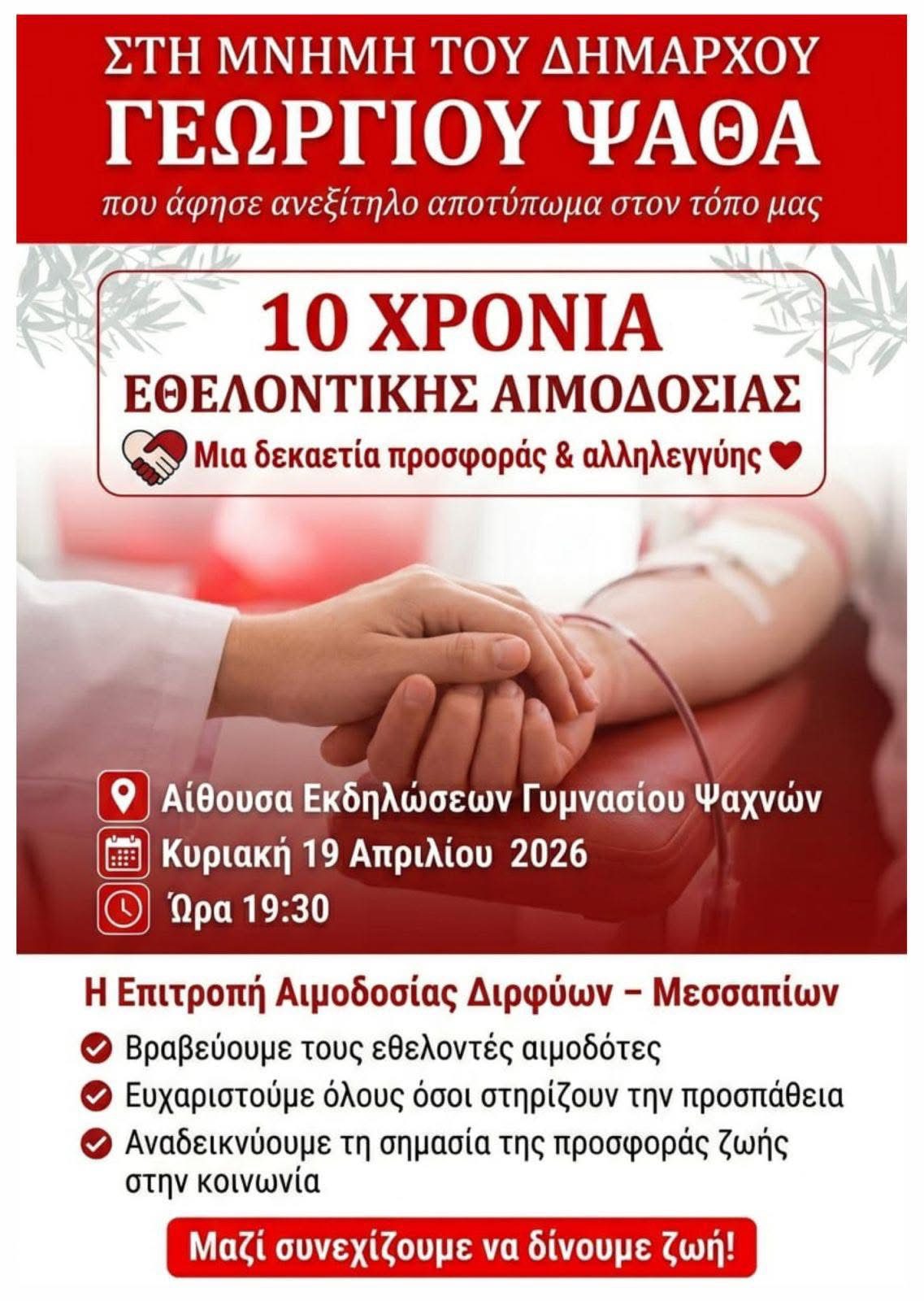 Την Κυριακή 19 Απριλίου 2026, στην Αίθουσα Εκδηλώσεων του Γυμνασίου Ψαχνών, στις 19:30, τιμούμε όσους προσφέρουν ζωή και λέμε ένα μεγάλο «ευχαριστώ» σε όλους όσοι στηρίζουν αυτή την προσπάθεια.