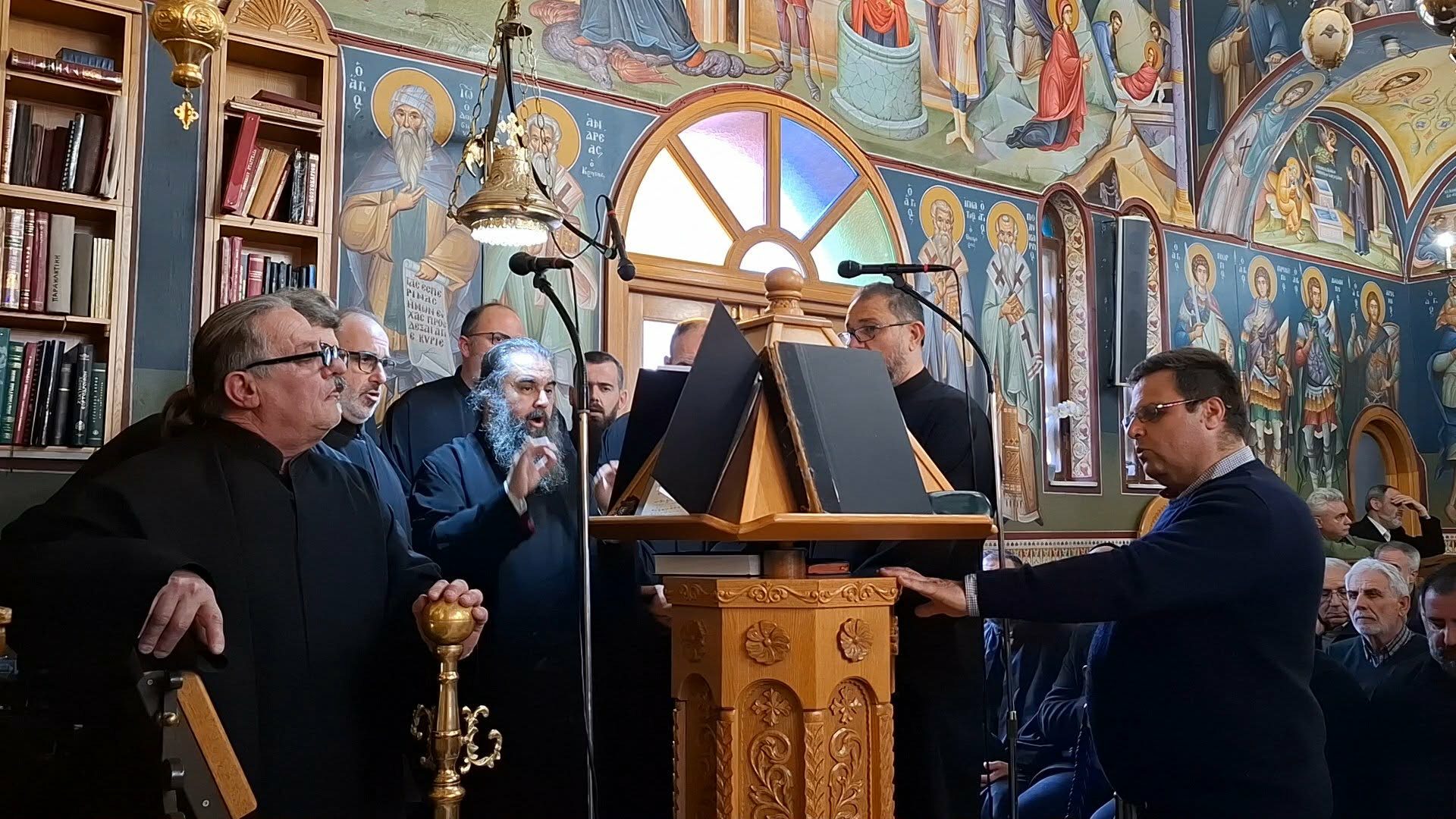 Πριν την την απόλυση του κατανυκτικού εσπερινού ο Σεβασμιώτατος Μητροπολίτης κ. Σεραφείμ απευθύνοντας τις πατρικές και εόρτιες ευχές του για την επικείμενη Μεγάλη Εβδομάδα συνεχάρει τα μέλη της χορωδίας της Σχολής της Βυζαντινής Μουσικής της Ιεράς Μητροπόλεως Καρυστίας με τον χοράρχη και Διευθυντή της Σχολής Πρωτοπρεσβύτερο Σωτήριο Τσούγκα για την κατανυκτική απόδοση των ύμνων του εσπερινού.