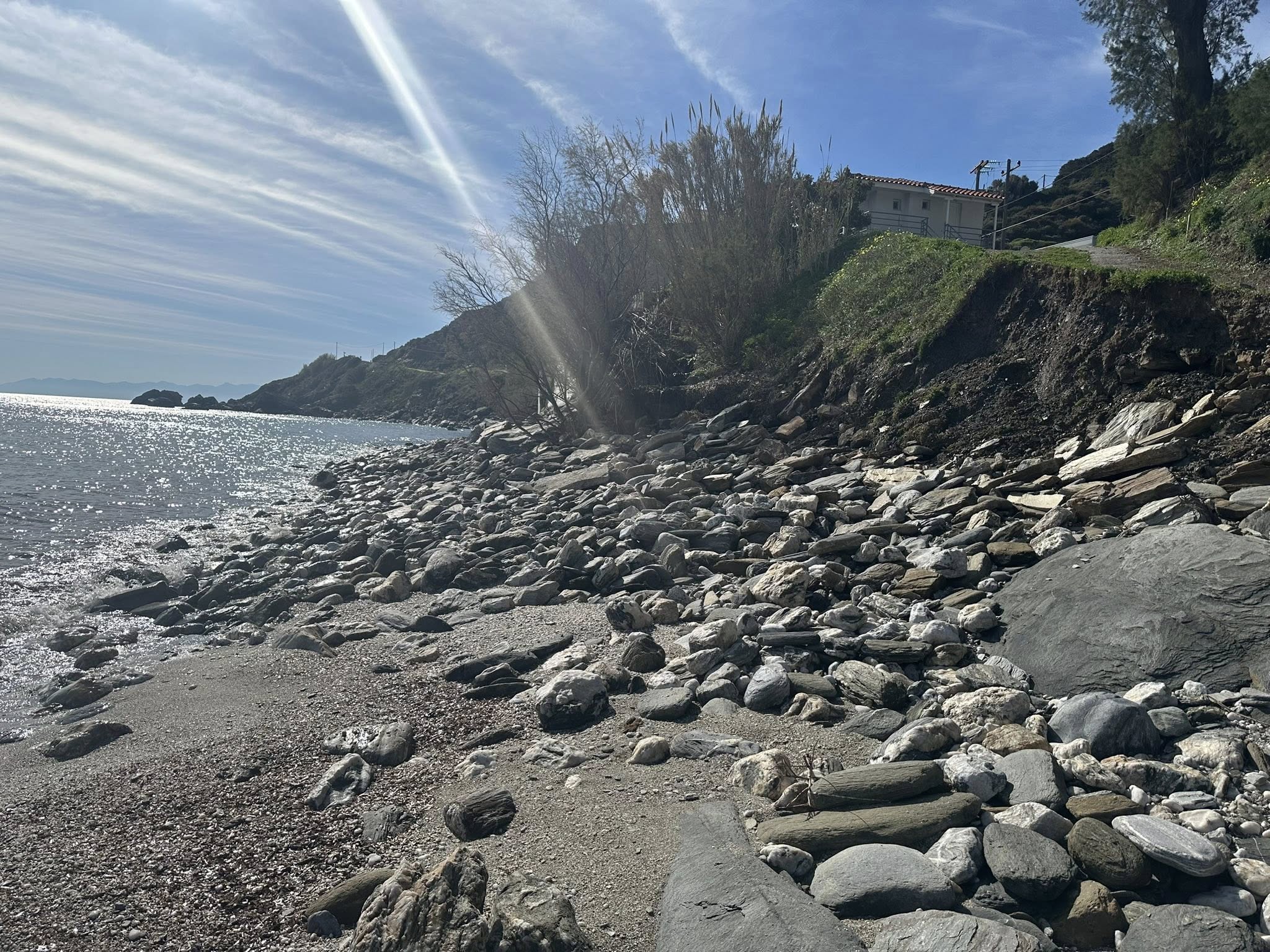 Τα έντονα καιρικά φαινόμενα με τους ισχυρούς Νοτιάδες και η συνεχιζόμενη διάβρωση των ακτών έχουν προκαλέσει εκτεταμένες ζημιές, με αποτέλεσμα – σύμφωνα με κατοίκους της περιοχής – να έχει απομείνει λιγότερο από το μισό τμήμα της παραλίας.