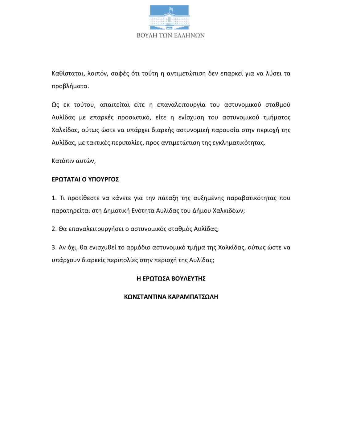 Η Βουλευτής ζητά από την Πολιτεία σαφείς απαντήσεις και άμεσες ενέργειες για την αντιμετώπιση της αυξημένης παραβατικότητας, την εξέταση της επαναλειτουργίας του αστυνομικού σταθμού Αυλίδας, καθώς και την ενίσχυση του Αστυνομικού Τμήματος Χαλκίδας, ώστε να διασφαλιστεί ουσιαστική και μόνιμη αστυνόμευση.
