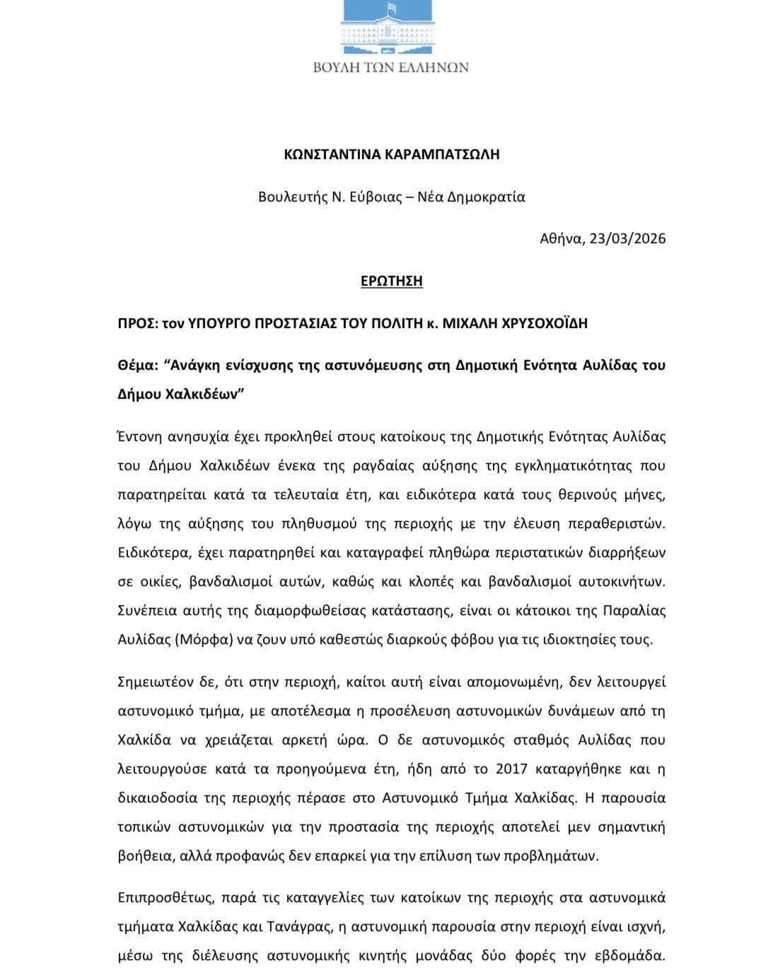 Κοινοβουλευτική παρέμβαση Καραμπατσώλη: Στο στόχαστρο η έξαρση εγκληματικότητας στην Αυλίδα. Ζητά άμεσα μέτρα για την ασφάλεια των κατοίκων